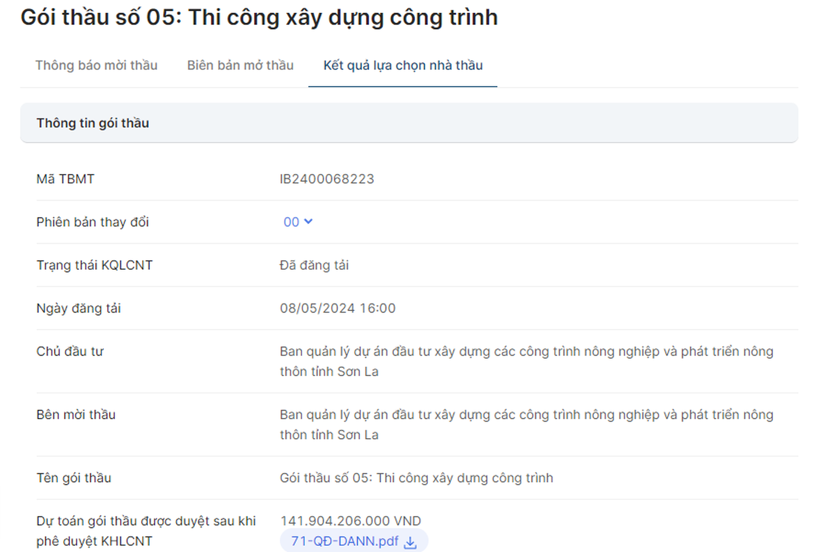 Ngày 24/4/2024, ông Nguyễn Văn Thể - Giám đốc Ban Quản lý Dự án Đầu tư Xây dựng các công trình NN&PTNT tỉnh Sơn La đã ký Quyết định số 76/QĐ-DANN về việc phê duyệt kết quả lựa chọn nhà thầu, Gói thầu số 05: Thi công xây dựng công trình, thuộc Dự án Đường giao thông nông thôn từ xã Cà Nàng (bản Phát) - xã Chiềng Khay (bản Nà Mùn) huyện Quỳnh Nhai. Gói thầu có giá dự toán 141,904 tỷ đồng.