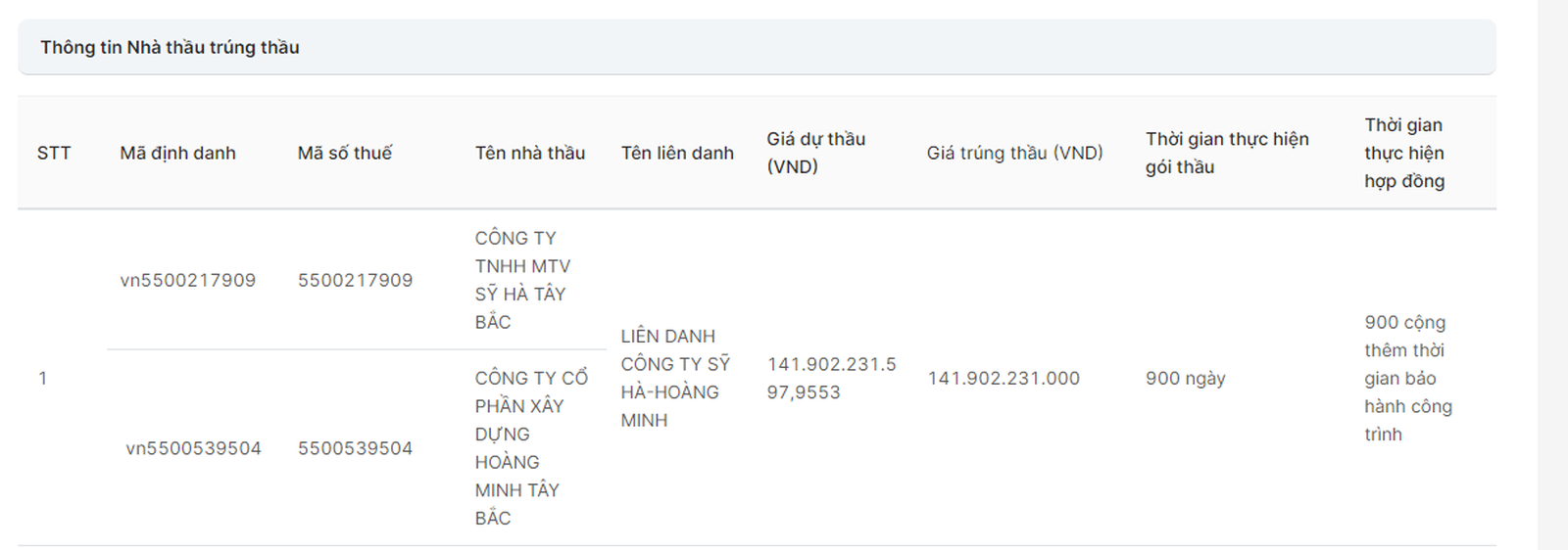 Đơn vị trúng thầu là liên danh Công ty TNHH MTV Sỹ Hà Tây Bắc - Công ty Cổ phần Xây dựng Hoàng Minh Tây Bắc, với giá trúng thầu 141,902 tỷ đồng, tiết kiệm được cho ngân sách khoảng 2 triệu đồng, tương ứng tỷ lệ tiết kiệm bằng 0%. Liên danh nói trên là nhà thầu duy nhất nộp hồ sơ tham dự.