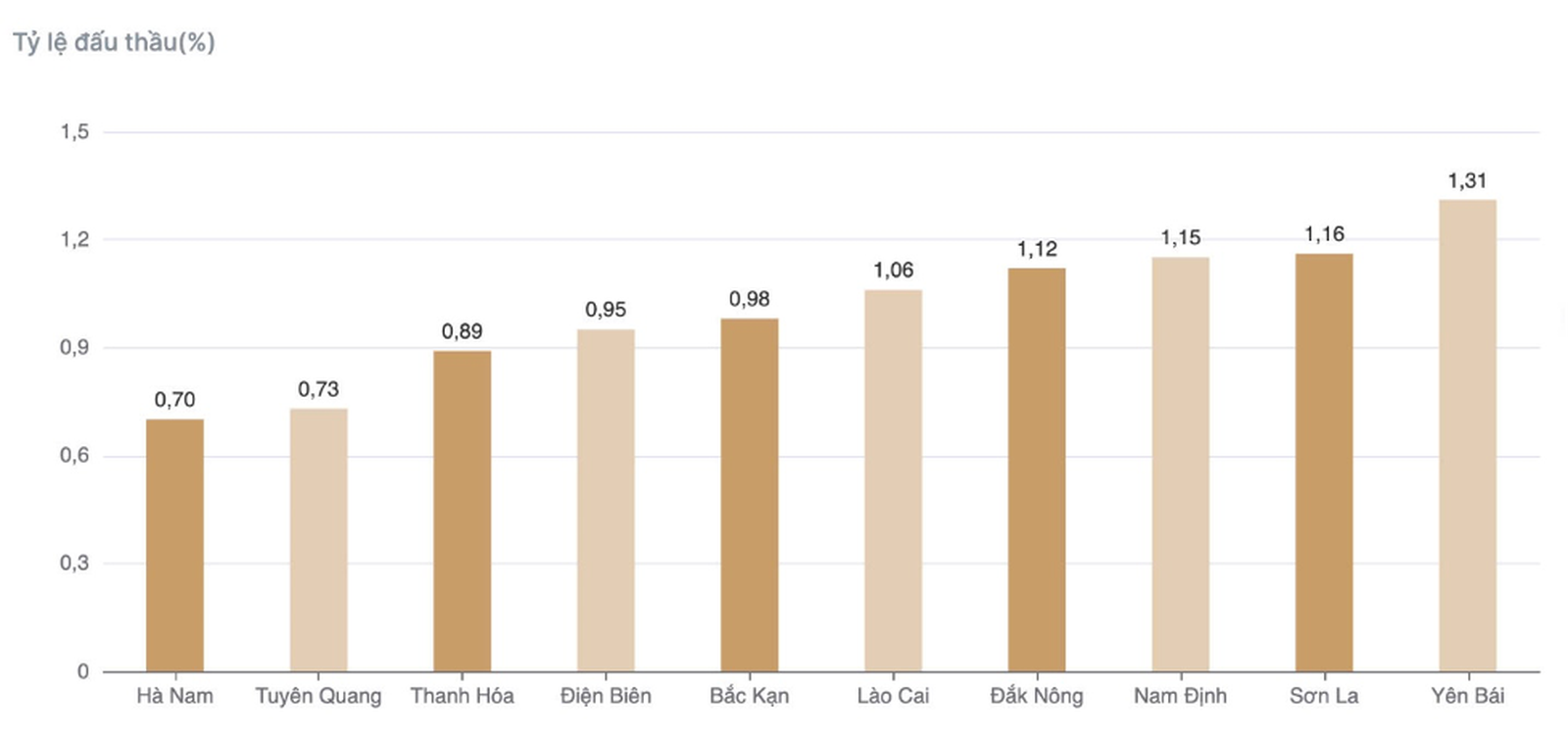 Tuy nhiên, cũng theo Hệ thống trên, top 10 địa phương có tỷ lệ tiết kiệm thấp trong đấu thầu qua mạng gồm: Hà Nam (0,7%), Tuyên Quang (0,7%), Thanh Hóa (0,86%), Điện Biên (0,91%), Bắc Kạn (0,97%), Lào Cai (1,04%), Sơn La (1,1%), Nam Định (1,14%), Đắk Nông (1,15%), Yên Bái (1,31%).