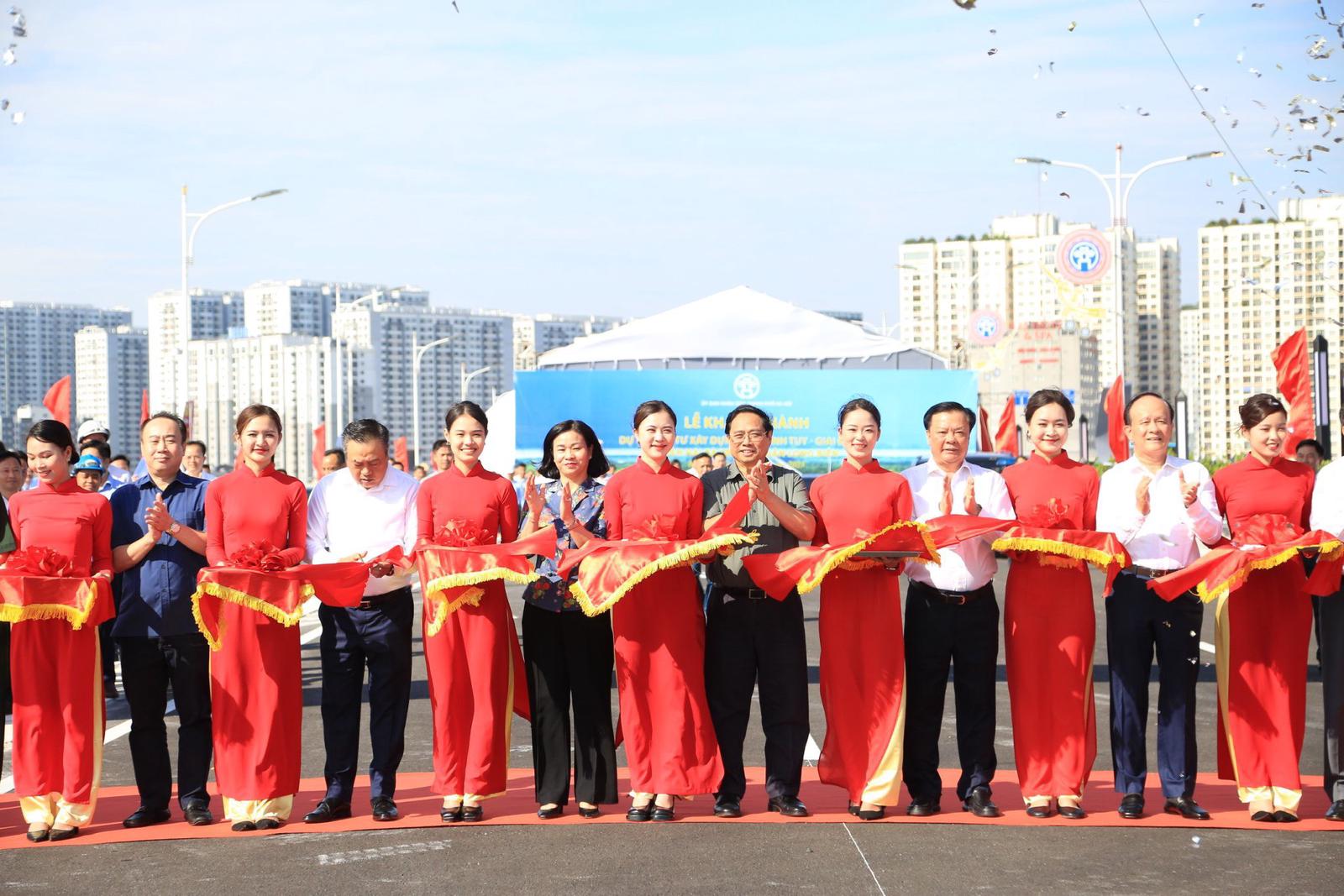 Thủ tướng Phạm Minh Chính cùng lãnh đạo TP Hà Nội cắt băng khánh thành. Ảnh: HH