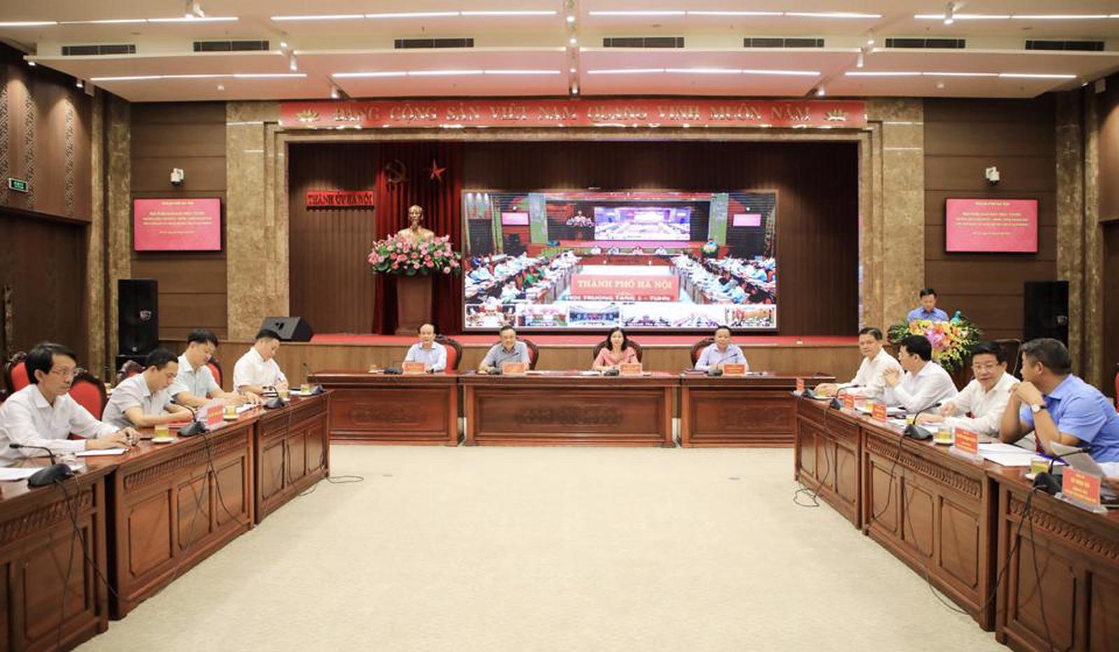 Lãnh đạo TP chủ trì hội nghị tại điểm cầu Thành uỷ Hà Nội. Ảnh: T.H
