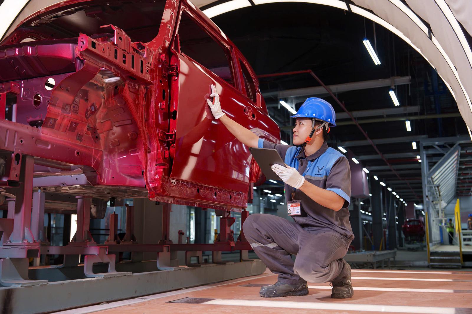 Kỹ sư và công nhân làm việc khẩn trương, bảo đảm tiến độ sản xuất các dòng xe điện VF 3, VF 5. Ảnh: NT
