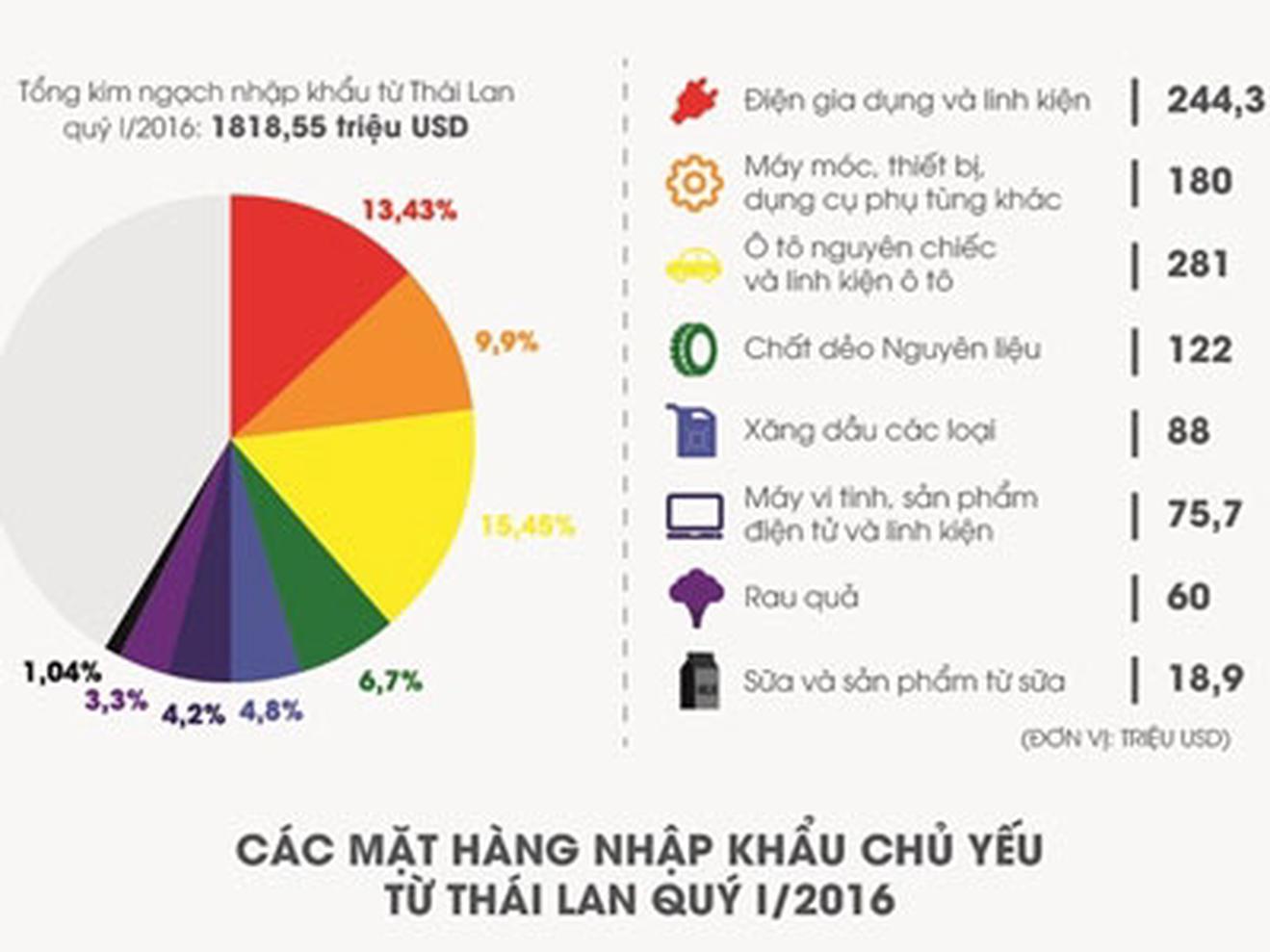 Tổng kim ngạch nhập khẩu từ Thái Lan của Việt Nam trong 3 tháng đầu năm 2016, theo Tổng cục Hải quan, là 1,818 tỷ USD.