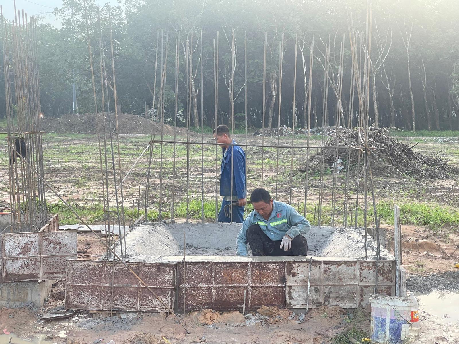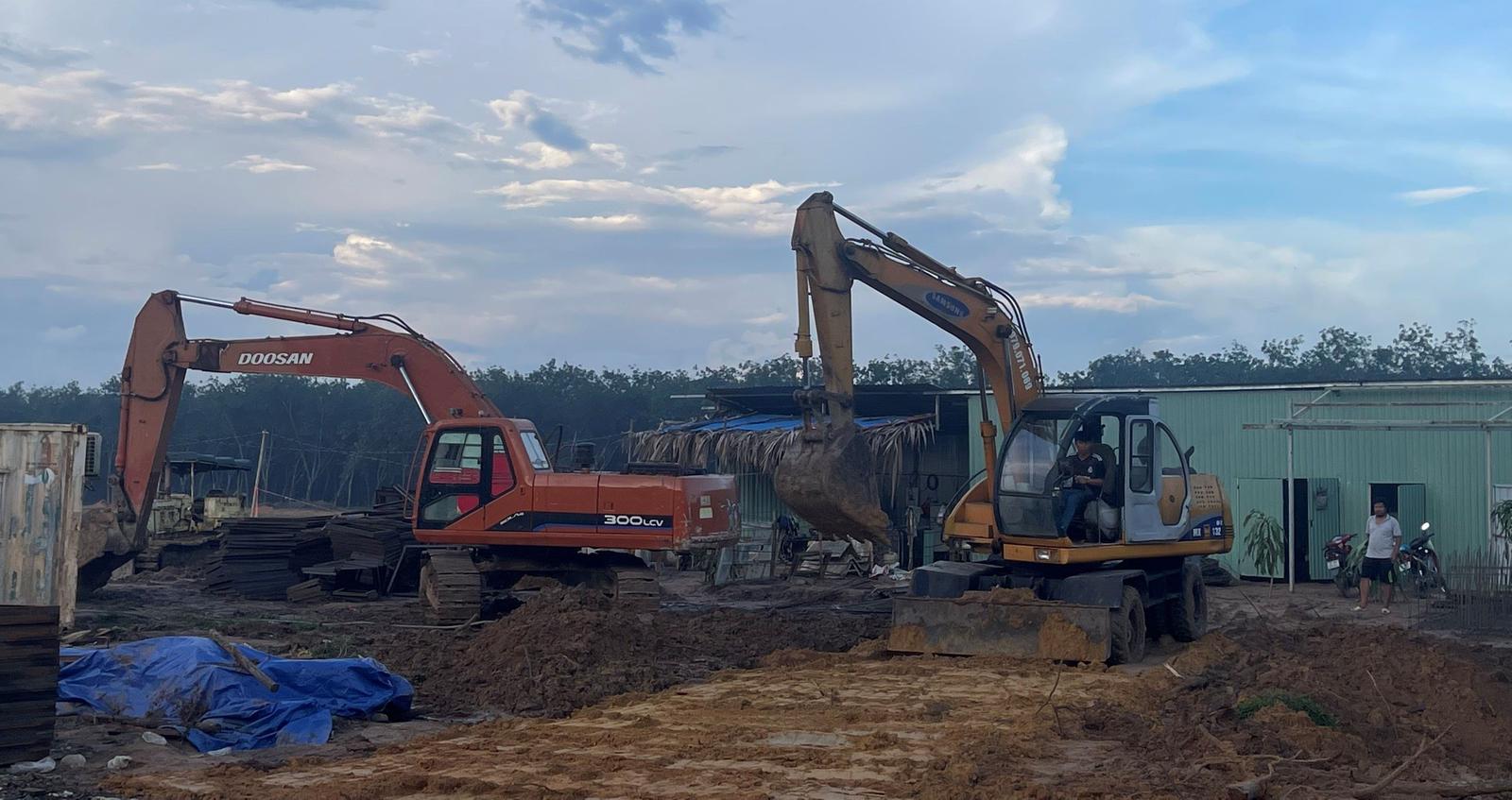 Đội thi công chỉ làm ống cống thoát nước, san gạt đất lấy mặt bằng, không có công việc gì mới do mặt bằng thi công toàn diện tích đất cao su, chưa thanh lý. Ảnh: Chí Cường