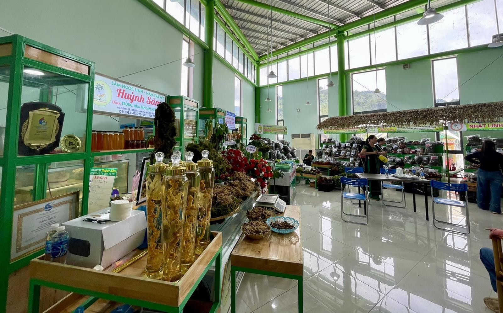 Nhiều gian hàng bán sâm Ngọc Linh, dược liệu trong lễ hội. Ảnh P.B