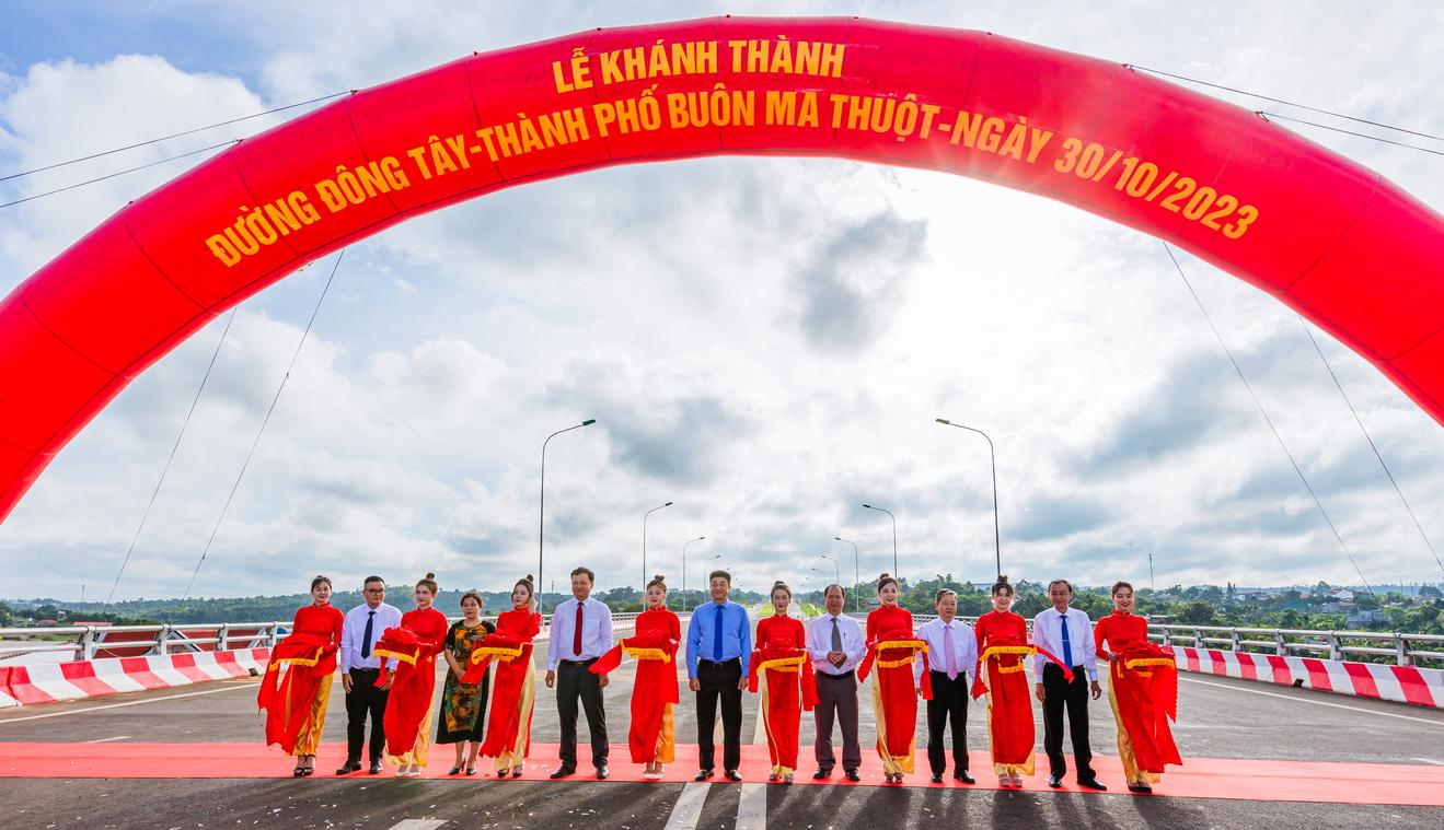 Lãnh đạo Thành ủy, Hội đồng nhân dân và Ủy ban nhân dân thành phố Buôn Ma Thuột cắt băng khánh thành công trình đường giao thông Đông Tây, thành phố Buôn Ma Thuột