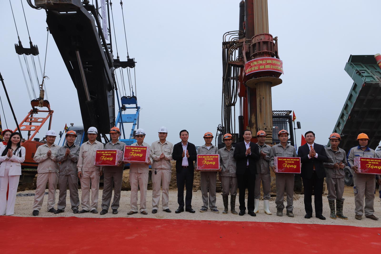 Bí thư Tỉnh ủy Thanh Hóa Đỗ Trọng Hưng và Chủ tịch UBND tỉnh Thanh Hóa trao quà động viên các nhà thầu đẩy nhanh tiến độ dự án. Ảnh: VT