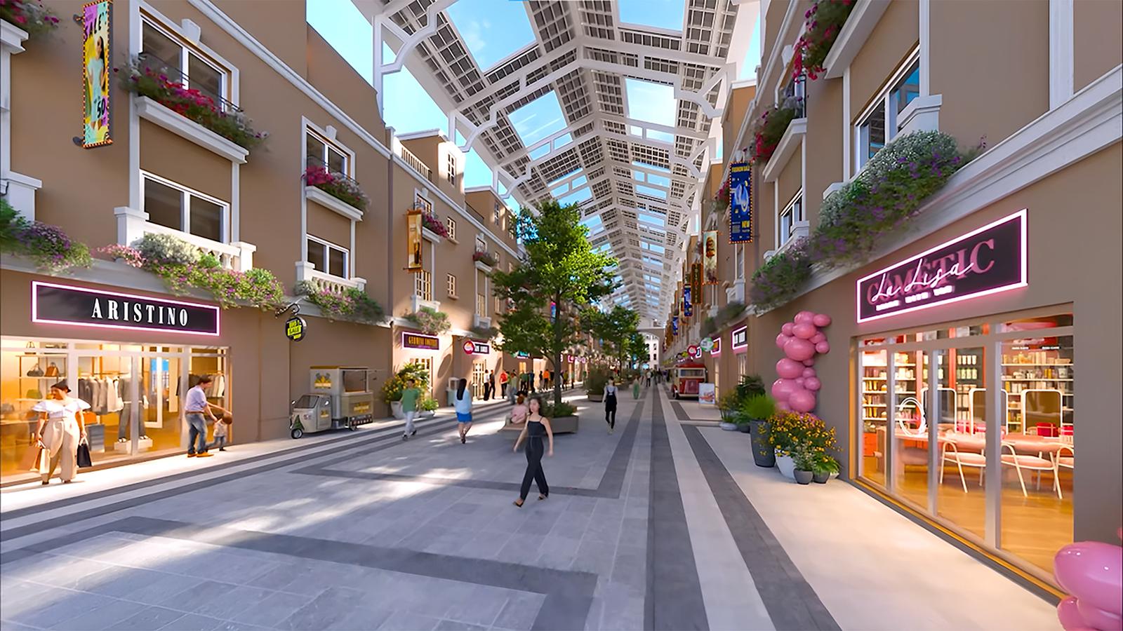 Các dãy shophouse hai mặt tiền nằm dọc phố đi bộ có mái che được ví như “thương phố” sầm uất giữa lòng thành phố, nơi hội tụ các hoạt động mua sắm, ẩm thực, giải trí, nhộn nhịp 24/7, bất kể thời tiết nắng hay mưa. Shophouse hai mặt tiền kết hợp phố đi bộ có mái che bao gồm 2 khối được nối với nhau bằng mái ngói kết hợp kính giúp tận dụng ánh sáng ban ngày và thông gió tự nhiên, ban đêm được chiếu sáng bằng điện năng lượng mặt trời.