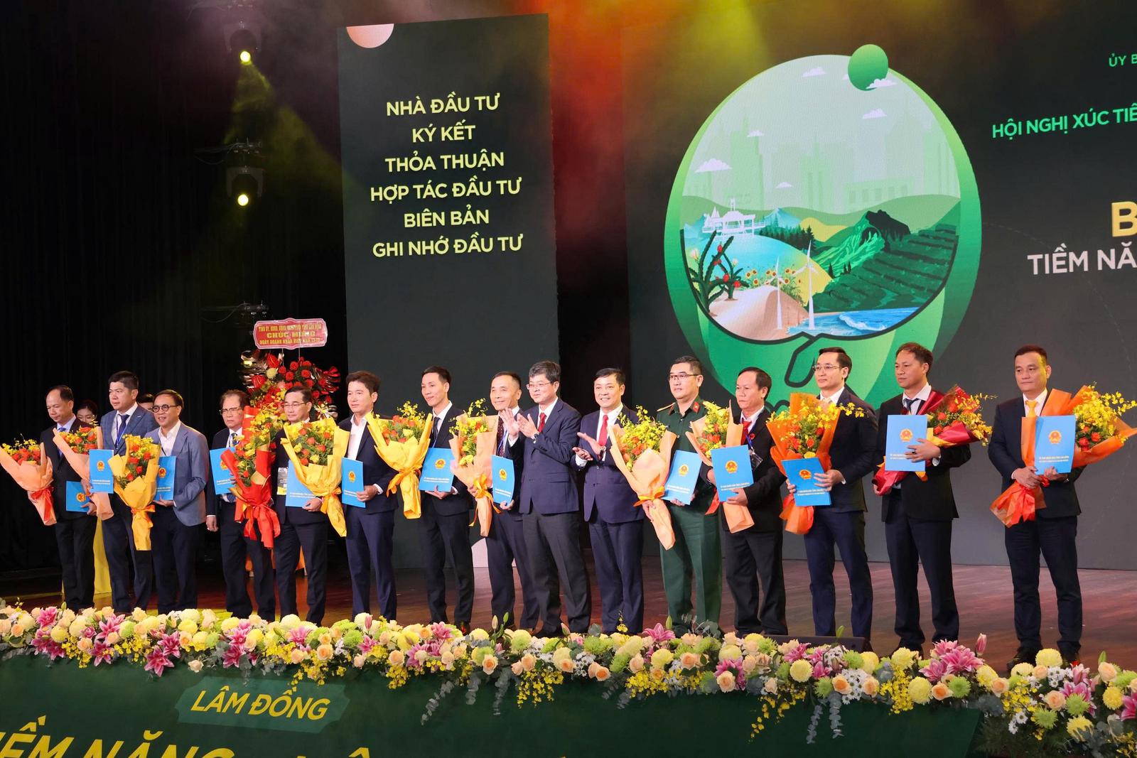 Tại hội nghị, Lâm Đồng đã trao Giấy chứng nhận đầu tư cho 9 doanh nghiệp và ký 3 biên bản ghi nhớ đầu tư trong các lĩnh vực khoáng sản, năng lượng tái tạo, nông nghiệp công nghệ cao, y tế và bất động sản – khẳng định niềm tin và sức hấp dẫn của môi trường đầu tư địa phương.