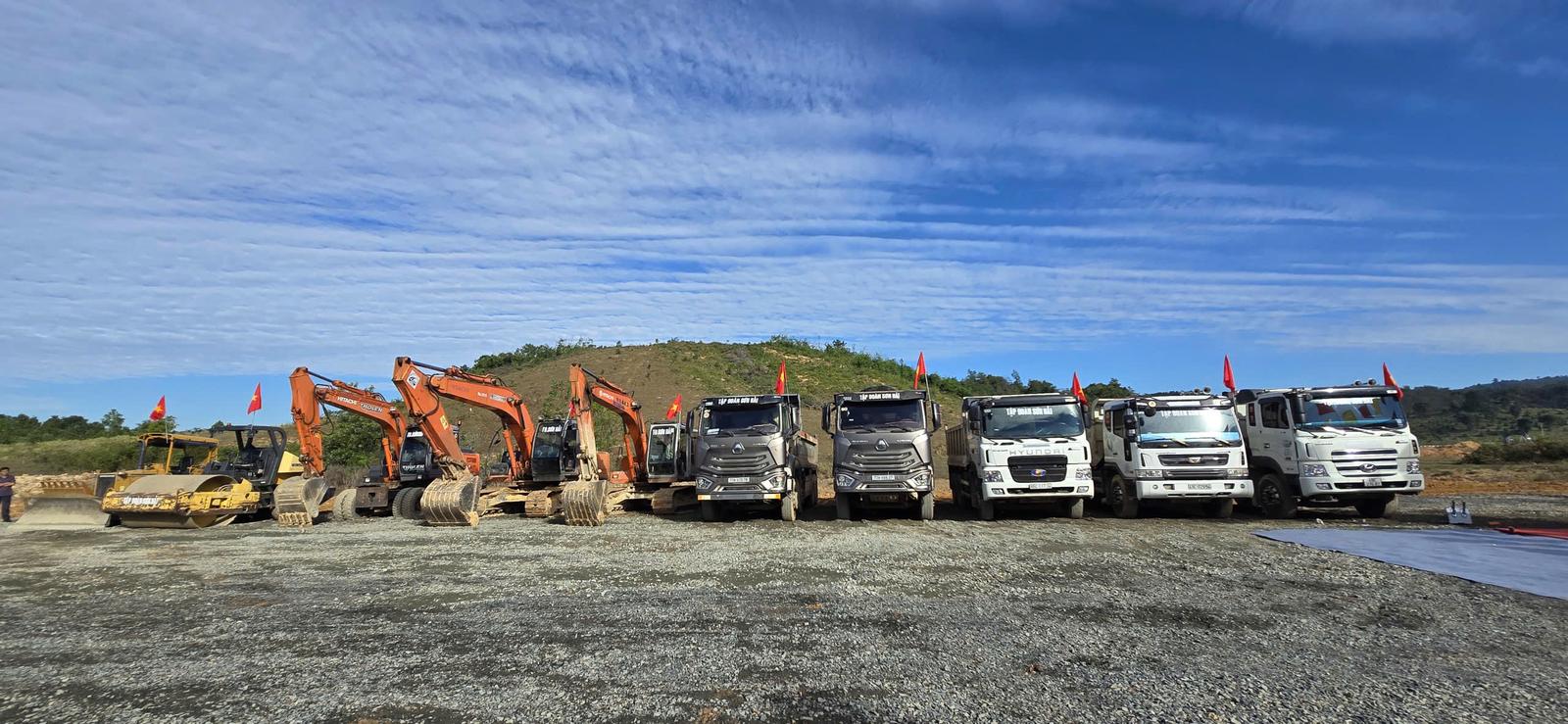 Thiết bị, máy móc được huy động để khởi công Dự án xây dựng đường bộ cao tốc Tân Phú (Đồng Nai) - Bảo Lộc (Lâm Đồng) sáng nay (19/12). Ảnh: Nhật Tiến