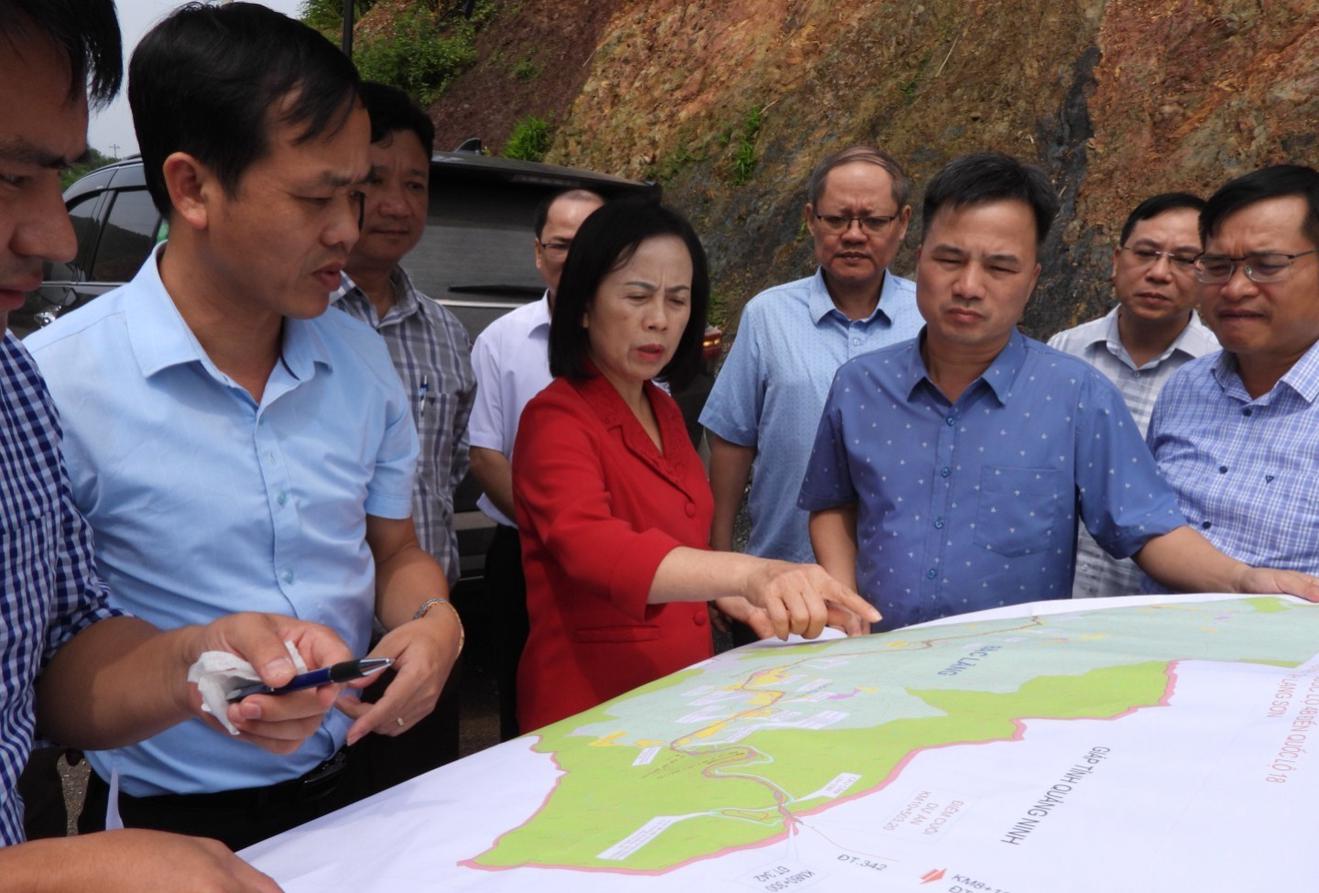 Phó Bí thư Thường trực Tỉnh ủy, chỉ đạo phương án giải quyết các vướng mắc ngay tại hiện trường dự án đường giao thông kết nối quốc lộ 4B với quốc lộ 18 huyện Đình Lập (cũ). Ảnh: Trang Ninh