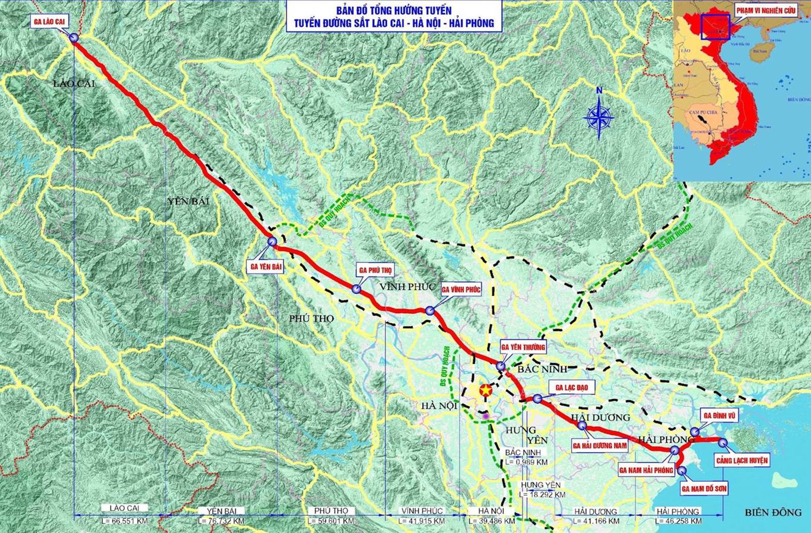 Bản đồ hướng tuyến dự án đường sắt Lào Cai – Hà Nội – Hải Phòng