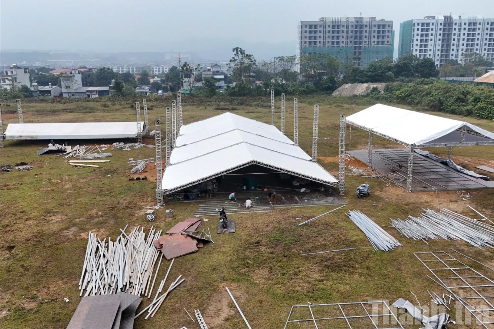 Công tác lắp dựng sân khấu tại ga Lào Cai được triển khai khẩn trương, đảm bảo kịp tiến độ phục vụ lễ khởi công cấp quốc gia. Ảnh: Bùi Bình
