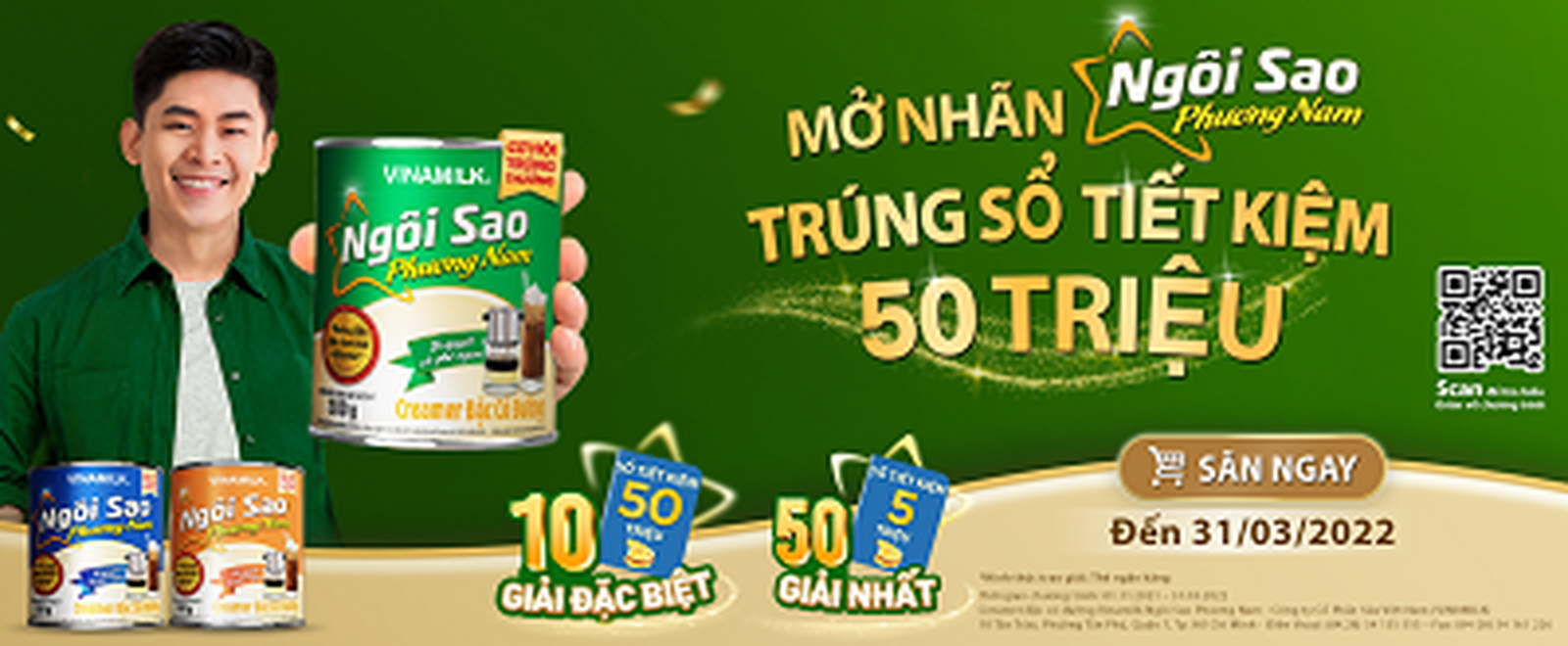 Chương trình “Mở nhãn, trúng sổ tiết kiệm 50 triệu” diễn ra từ ngày 01/11/2021 đến hết 31/03/2022 vẫn đang chờ các chủ nhân may mắn. Các sản phẩm Ngôi Sao Phương Nam lon/ hộp thiếc 380g trong chương trình sẽ có bao bì được thiết kế riêng biệt, đồng thời vẫn giữ nguyên chất lượng thơm ngon, sánh mịn. Mặt ngoài nhãn có in thông tin và hình ảnh về chương trình khuyến mại, mặt trong nhãn có in thông tin trúng thưởng. Khách hàng có thể tìm mua sản phẩm Ngôi Sao Phương Nam lon/ hộp thiếc 380g từ kênh mua sắm trực tuyến hoặc mua trực tiếp tại hệ thống cửa hàng Giấc Mơ Sữa Việt, các cửa hàng bán lẻ, chuỗi siêu thị trên toàn quốc.