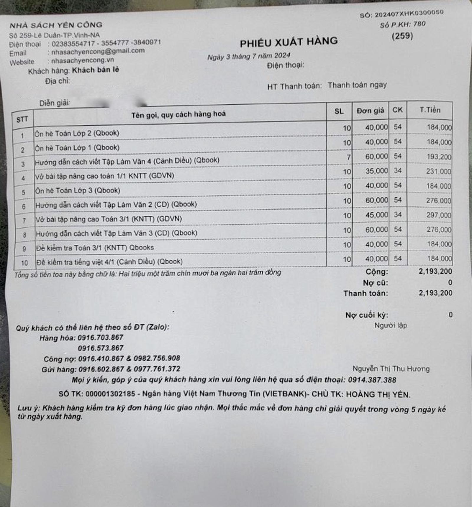 Bên cạnh đó, chị Huệ nêu quan điểm, việc nhà sách Yến Công bán sách với chính sách chiết khấu lên đến 54% - 55% và việc các đơn hàng này không có hoá đơn, chứng từ cũng làm dấy nên nghi vấn về việc nguồn gốc của sách, nghĩa vụ về thuế Nhà nước của nhà sách Yến Công trong những năm qua?
