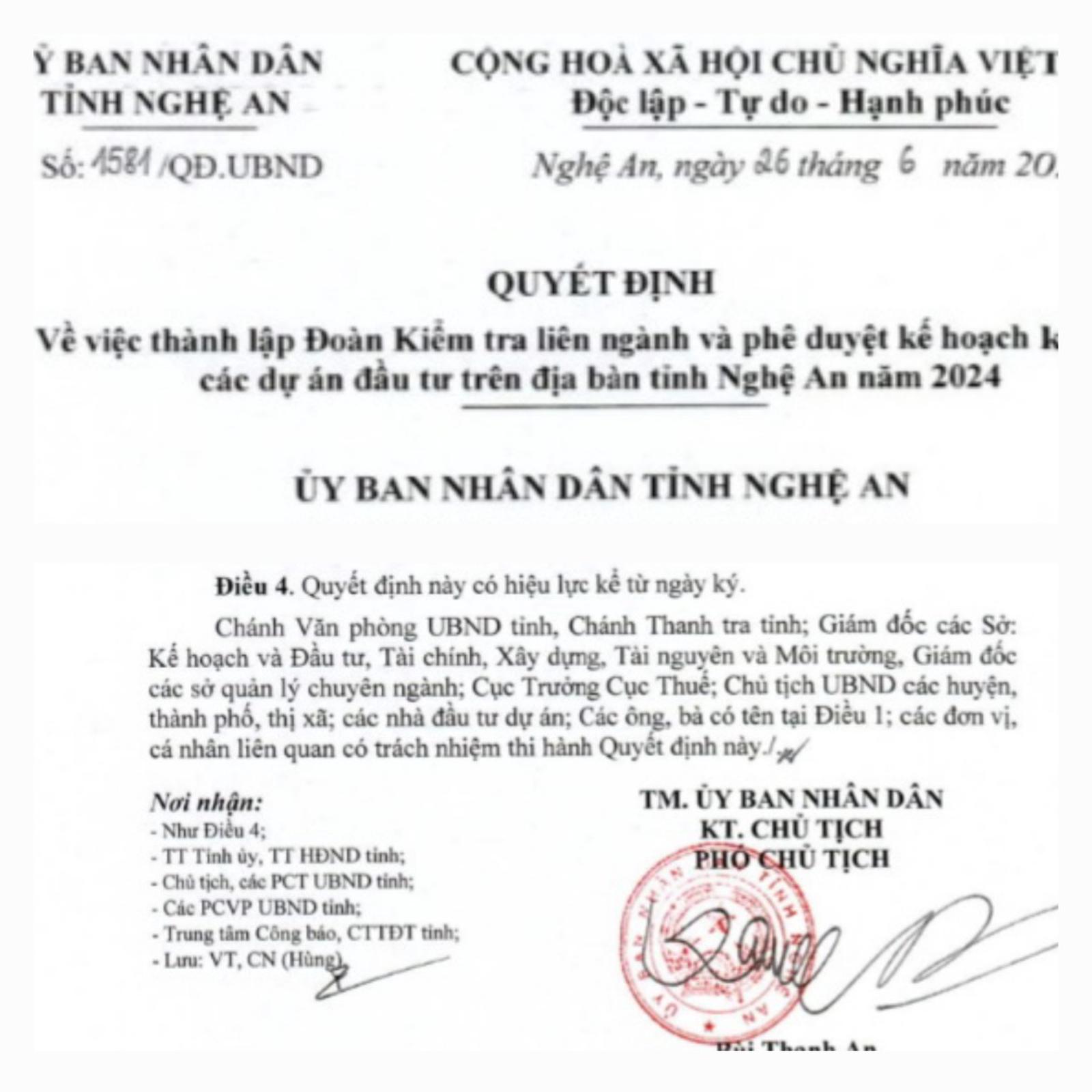 Quyết định thành lập đoàn kiểm tra của UBND tỉnh Nghệ An. Ảnh: XT