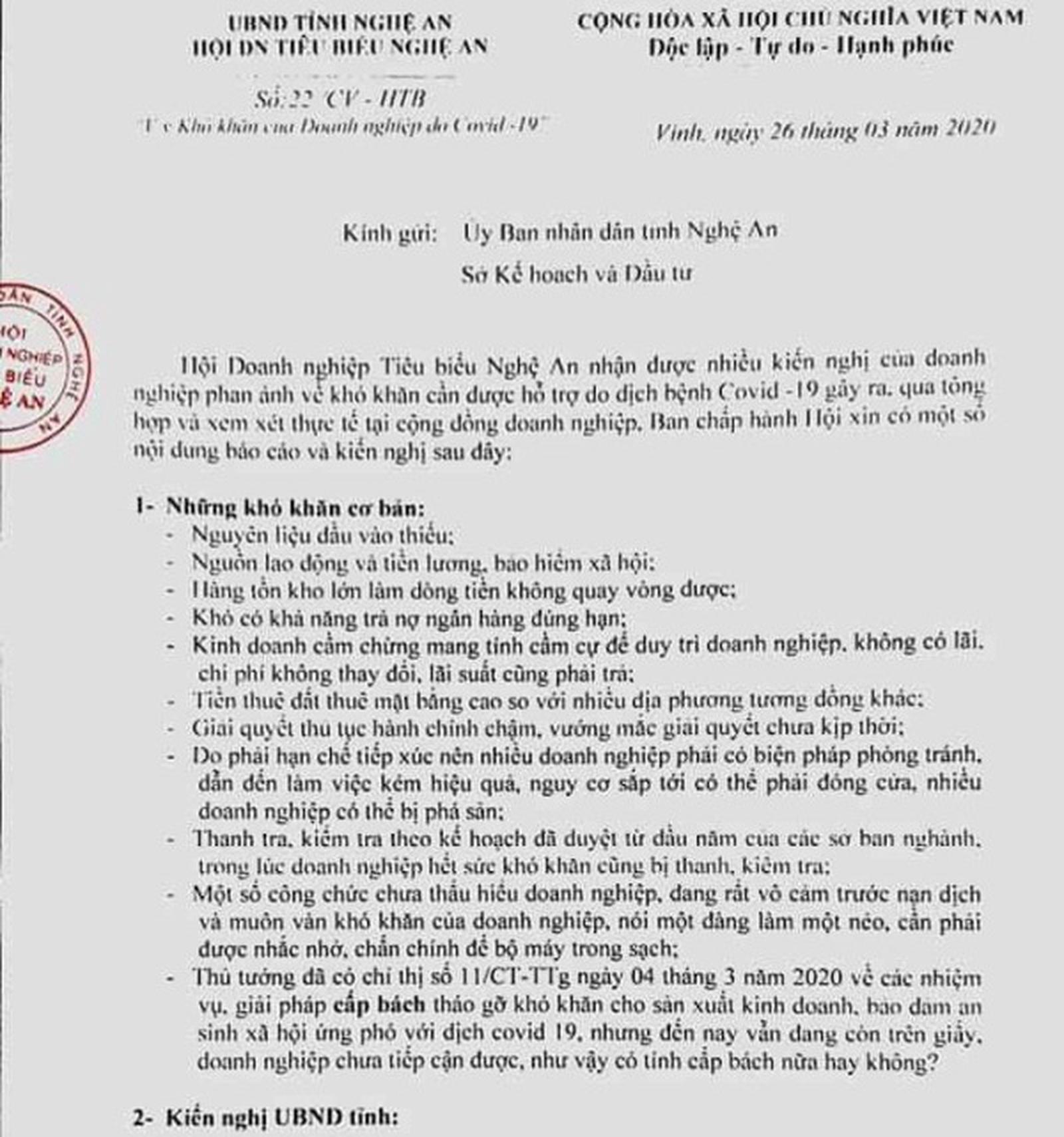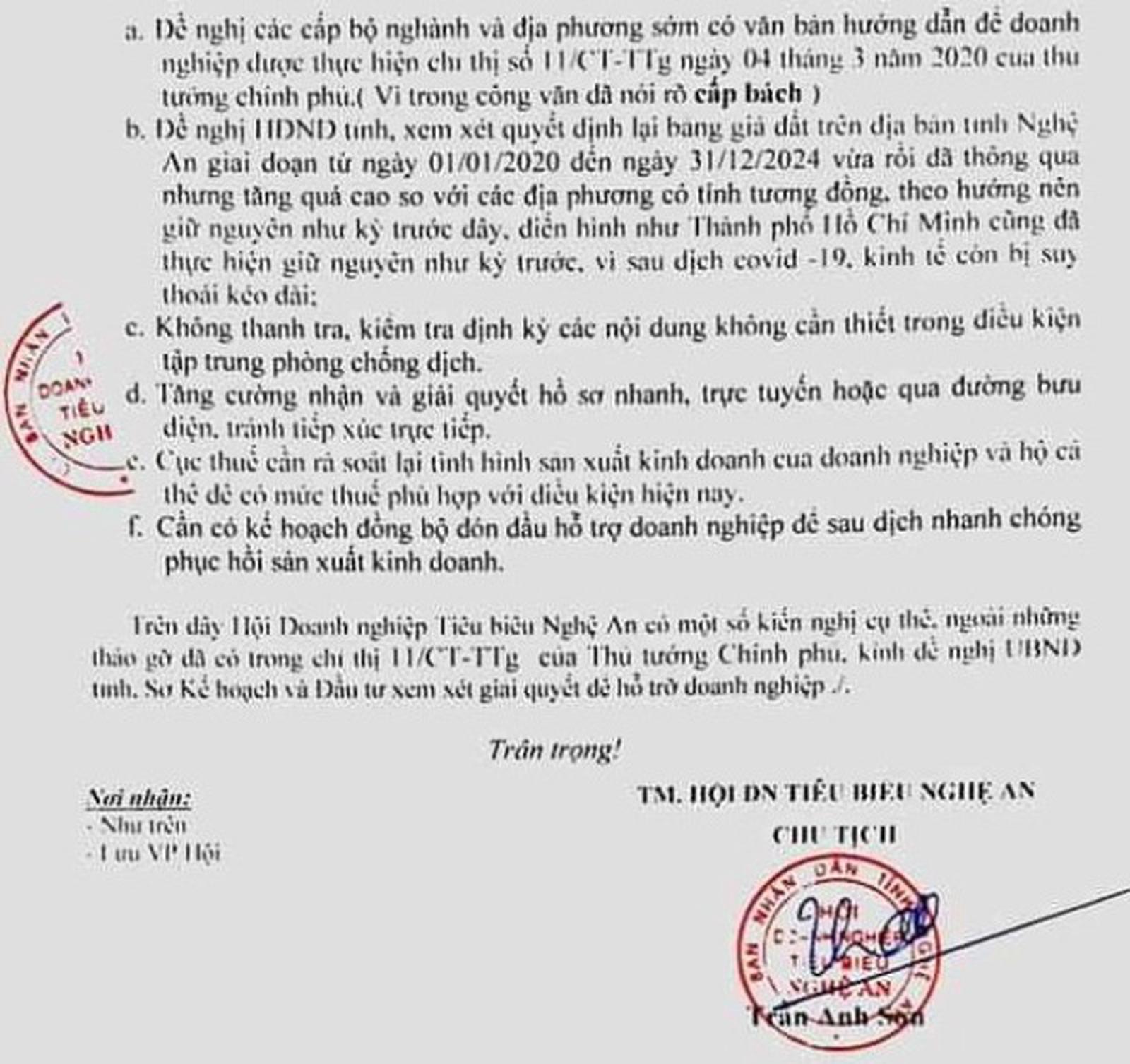 Còn ông Trần Anh Sơn- Chủ tịch Hội DN tiêu biểu Nghệ Anđề nghị HĐND tỉnh xem xét, quyết định lại bảng giá đất trên địa bàn giai đoạn 2020-2024 vừa được tỉnh thông qua theo hướng nên giữ nguyên như trước kia. Ngoài ra, tạm dừng thanh tra, kiểm tra định kỳ DN trong thời điểm này và cho đến hết năm 2020.