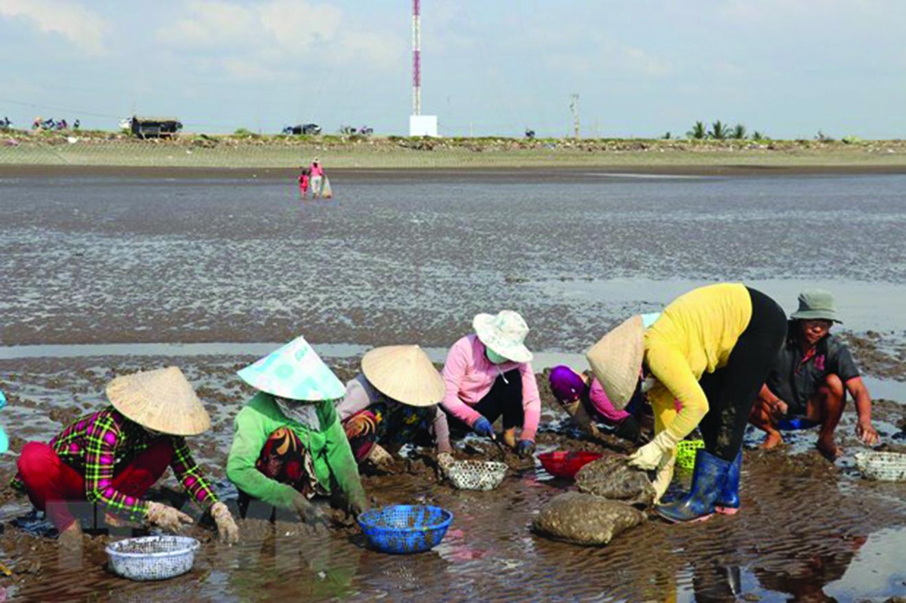Thu hoạch nghêu tại bãi biển Tân Thành, huyện Gò Công Đông, tỉnh Tiền Giang. Ảnh: Hữu Chí