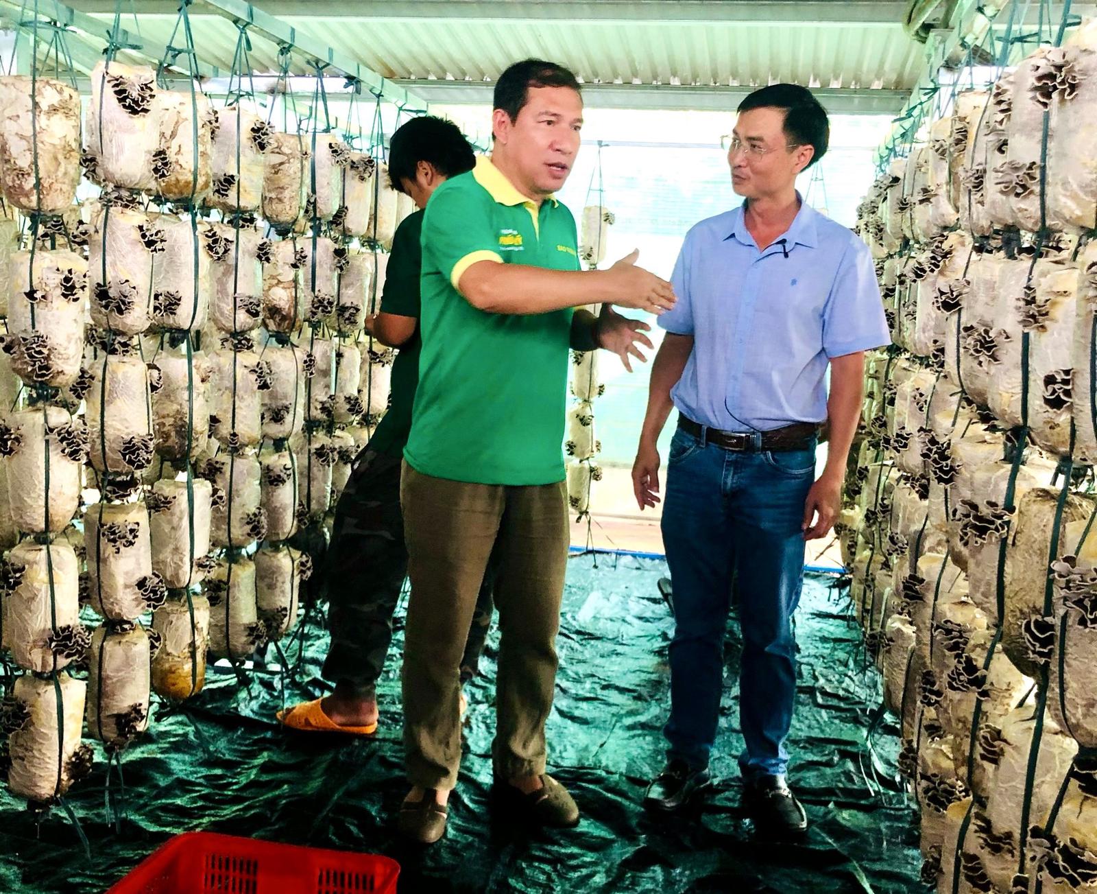 Trang trại nấm của anh Trường được nhiều tổ chức, cá nhân đến thăm quan. Ảnh: AM.