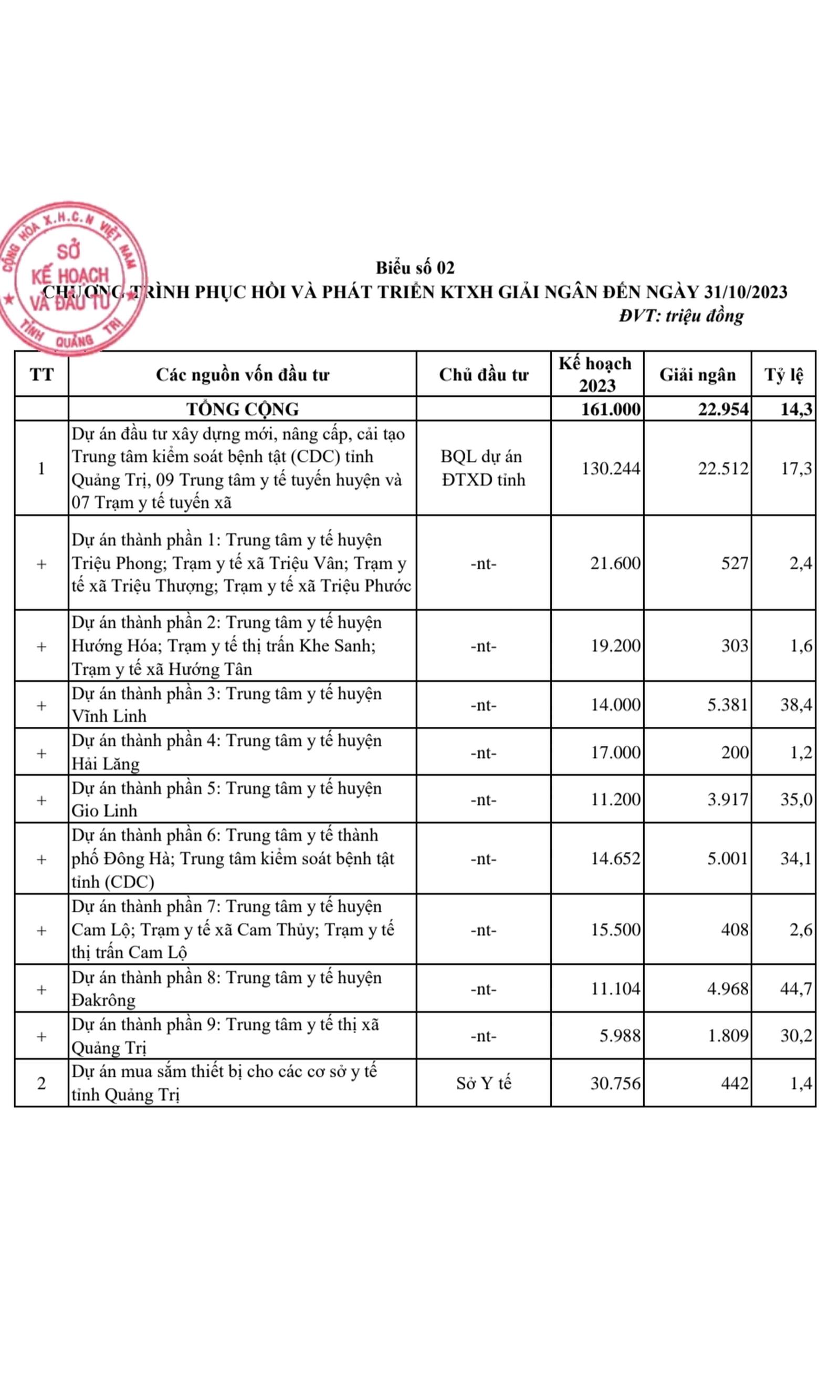Tuy nhiên, chương trình phục hồi và phát triển kinh tế - xã hội chỉ mới giải ngân được trên 22,9/161 tỷ đồng, đạt 14,3% kế hoạch. Một số dự án có tỷ lệ giải ngân thấp, như: Dự án thành phần 2 (Trung tâm Y tế huyện Hướng Hóa, Trạm Y tế thị trấn Khe Sanh, Trạm y tế xã Hướng Tân) chỉ đạt 1,6%, dự án thành phần 4 (Trung tâm Y tế huyện Hải Lăng) chỉ đạt 1,2%, dự án mua mua sắm thiết bị cho các cơ sở y tế tỉnh Quảng Trị chỉ đạt 1,4%...