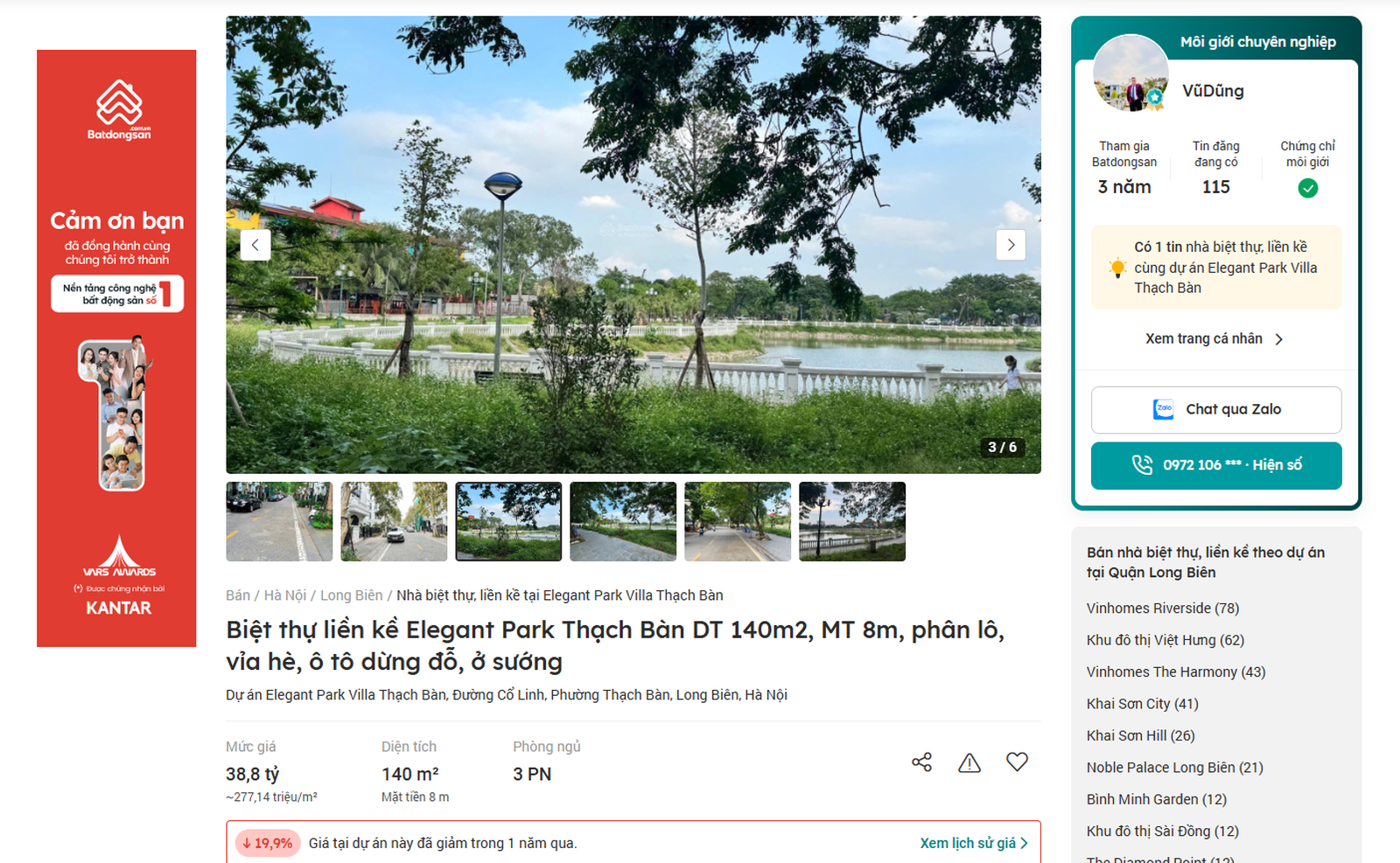 Trên địa bàn quận Long Biên, Elegant Park Thạch Bàn có mức giảm đáng kể. Một số thành viên của trang tin rao vặt bất động sản nổi tiếng Batdongsan.com.vn đăng tin bán biệt thự Elegant Park với giá 38,8 tỷ đồng cho 1 căn rộng 140m2 (tương đương 277 triệu đồng/m2). Dữ liệu của Batdongsan.com.vn cho thấy giá biệt thự tại dự án này giảm 19,9% trong 1 năm qua. Biểu đồ giao dịch cho thấy, dự án chỉ thực sự hạ nhiệt sau quý 1/2025, trước đó là đi ngang.