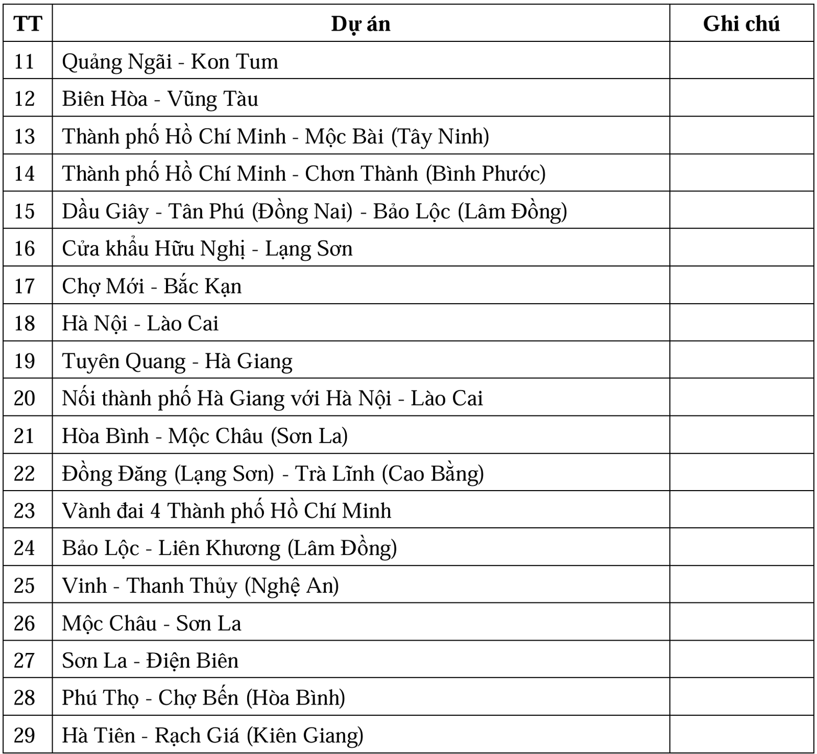 29 dự án quan trọng quốc gia gồm: Tuyến đường bộ cao tốc Bắc - Nam phía Đông từ Lạng Sơn đến Cà Mau; các tuyến đường cao tốc kết nối liên vùng khu vực phía Bắc, kết nối miền Trung với Tây Nguyên, khu vực Đông Nam Bộ và Đồng bằng sông Cửu Long.