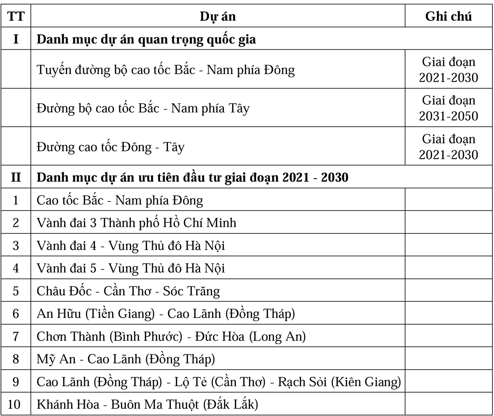 Theo Bộ GTVT danh mục dự án quan trọng điểm quốc gia, dự án ưu tiên đầu tư trong quy hoạch là định hướng nghiên cứu đầu tư và xem xét bố trí nguồn lực để làm cơ sở triển khai thực hiện.