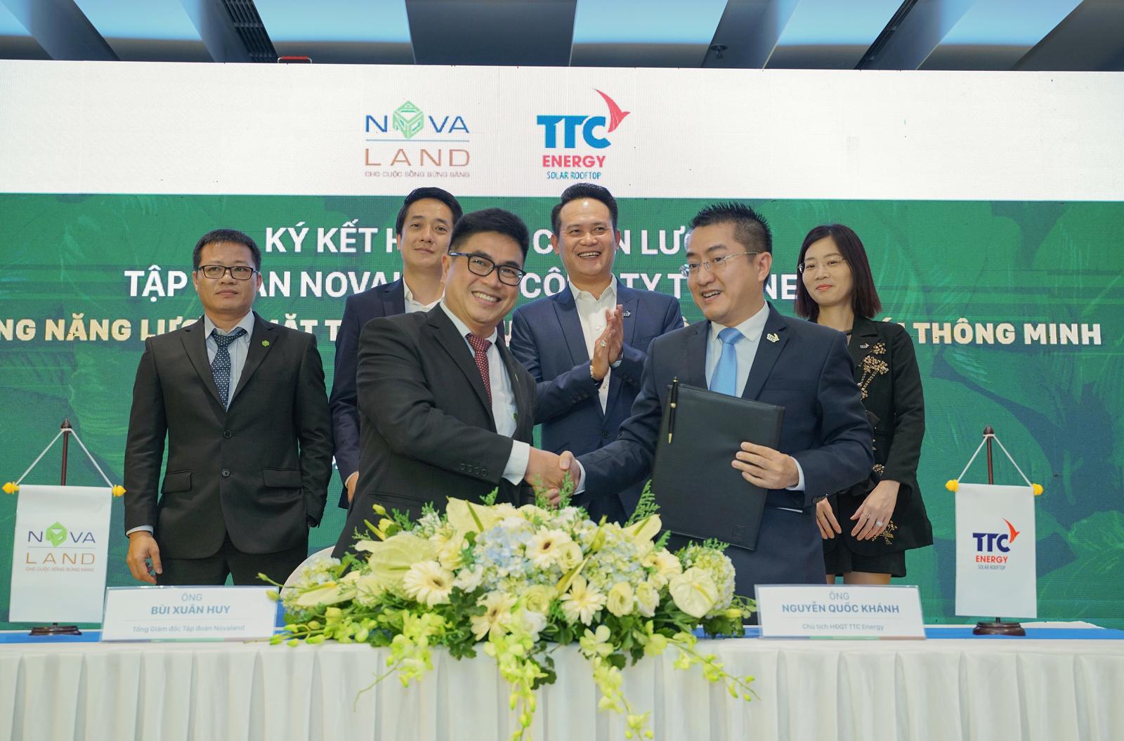 Ông Bùi Xuân Huy - Tổng Giám đốc Tập đoàn Novaland và ông Nguyễn Quốc Khánh - Chủ tịch HĐQT TTC Energy thực hiện nghi thức ký kết