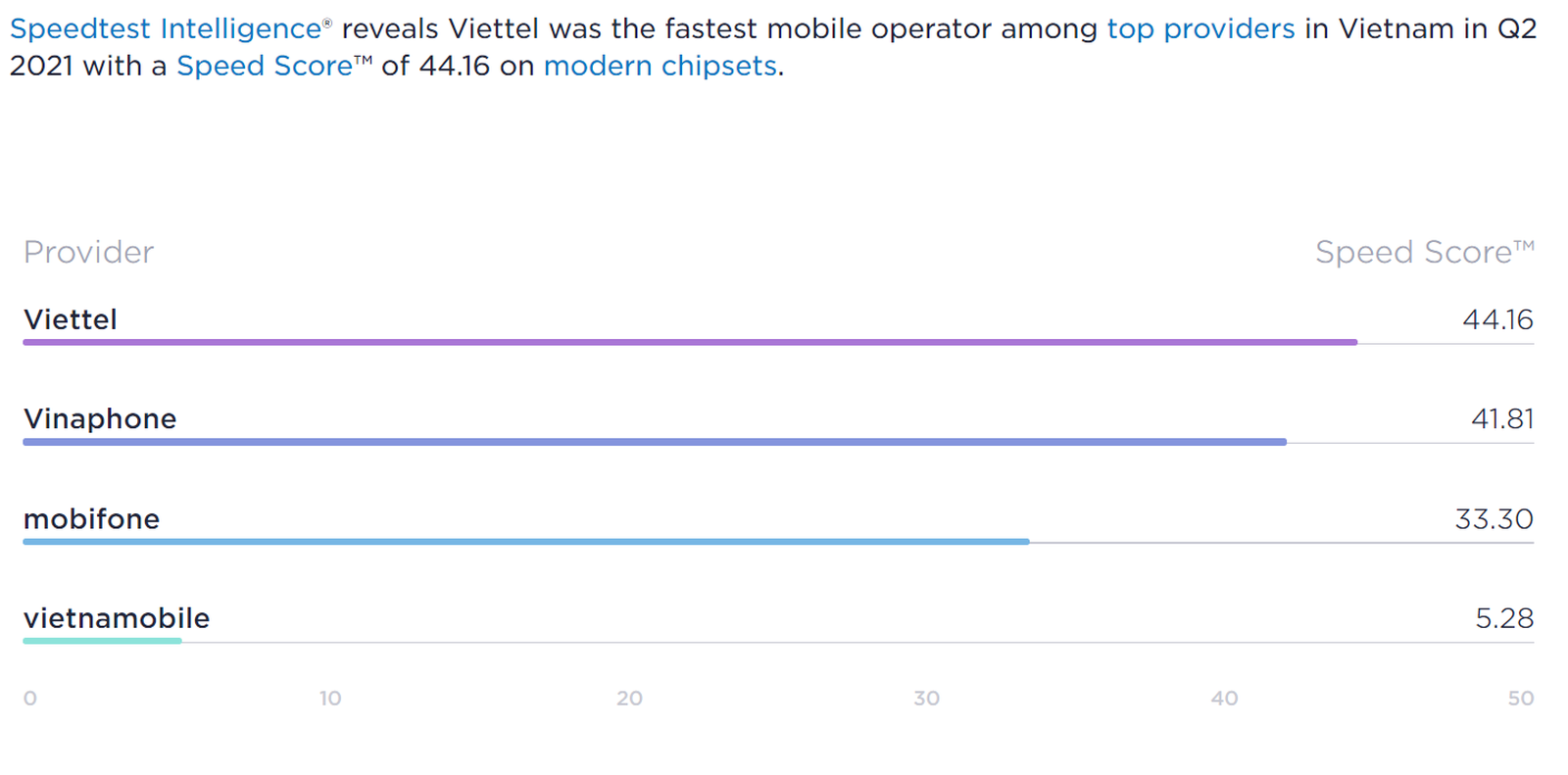Dịch vụ di động quý 1 Viettel đạt 38,55 điểm, quý 2 đạt 44,16 điểm; dịch vụ cố định băng rộng quý 1 Viettel đạt 59,76 điểm, quý 2 đạt 66,77 điểm. Thông tin này được công bố trên website https://www.speedtest.net/ của hãng.