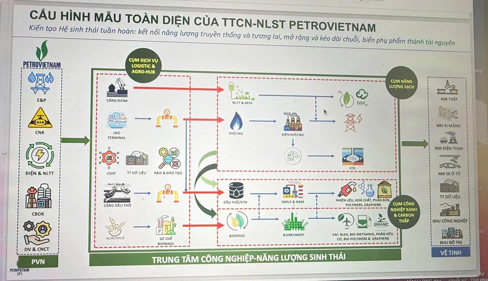 Theo trình bày của đại diện Viện Dầu khí Việt Nam (PVI), mô hình Trung tâm công nghiệp - năng lượng sinh thái có mục tiêu mở rộng sản phẩm, phát triển chuỗi dự án khí điện của tập đoàn tại TP Cần Thơ; sử dụng lợi thế của đồng bằng sông Cửu Long về Biomass, sinh khối cũng như nông sản, công nghiệp, nông nghiệp công nghệ cao. Qua đó để triển khai ba nhóm năng lượng sạch (trung tâm điện khí, trung tâm năng lượng mới và lưu trữ carbon); nhóm về công nghiệp phân bón và hóa chất xanh, phân bón hữu cơ; nhóm về nông nghiệp công nghệ cao, các loại dịch vụ kỹ thuật công nghệ cao.