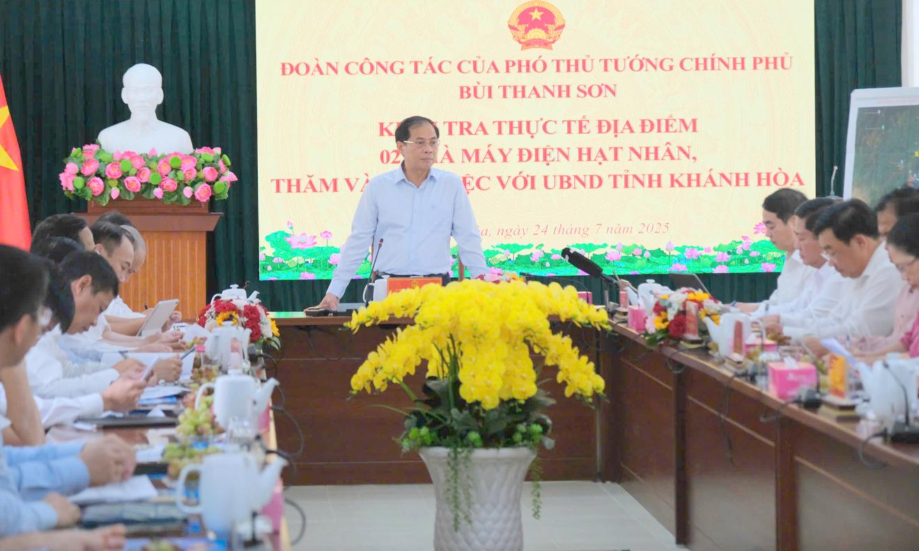 (Thanh tra) - Ngày 24/7, tại phường Phan Rang, Phó Thủ tướng Chính phủ Bùi Thanh Sơn dẫn đầu đoàn công tác Trung ương làm việc với lãnh đạo tỉnh Khánh Hòa về tình hình triển khai Dự án Nhà máy điện hạt nhân Ninh Thuận 1 và Ninh Thuận 2.