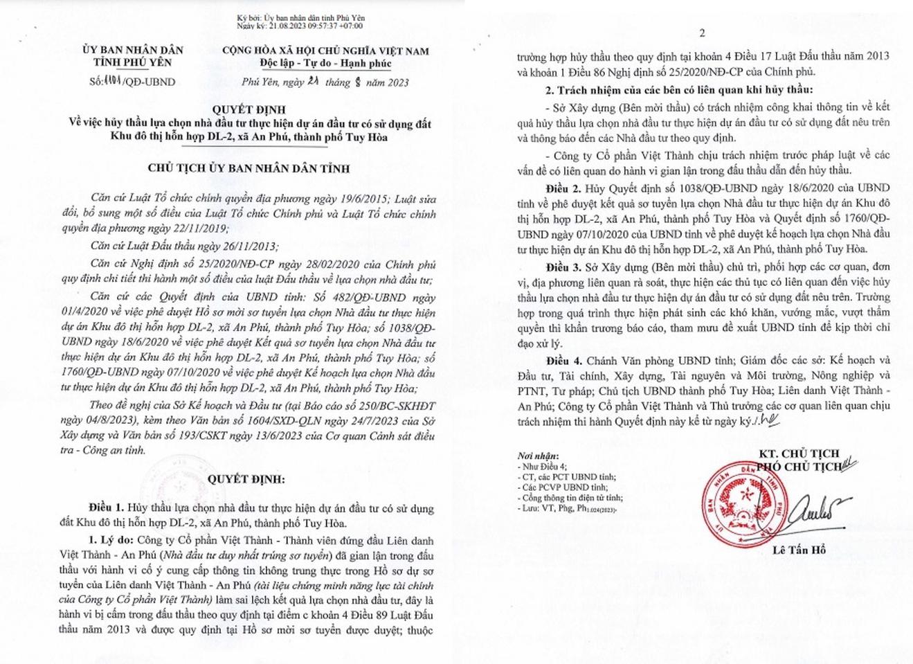 UBND tỉnh quyết định hủy thầu lựa chọn nhà đầu tư thực hiện dự án đầu tư có sử dụng đất Khu đô thị hỗn hợp DL-2, xã An Phú, TP Tuy Hòa. Lý do vì Công ty Cổ phần Việt Thành - thành viên đứng đầu Liên danh Việt Thành - An Phú (nhà đầu tư duy nhất trúng sơ tuyển) đã gian lận trong đấu thầu với hành vi cố ý cung cấp thông tin không trung thực trong hồ sơ dự sơ tuyển của Liên danh Việt Thành - An Phú (tài liệu chứng minh năng lực tài chính của Công ty Cổ phần Việt Thành) làm sai lệch kết quả lựa chọn nhà đầu tư.
