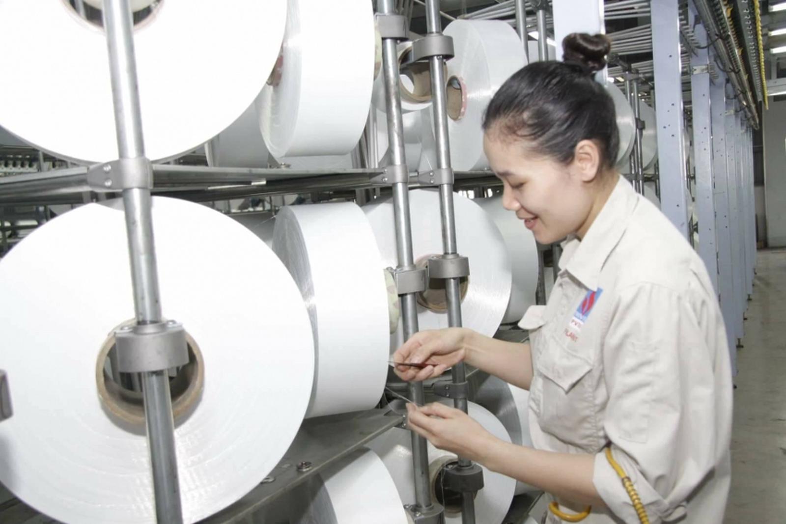 Công nhân kiểm tra chất lượng sợi Filament tại Nhà máy Xơ sợi Đình Vũ.