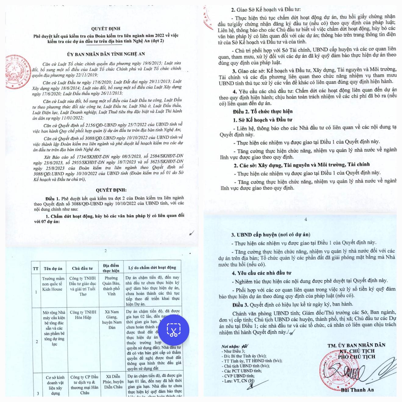 Quyết định chấm dứt 7 DA sau kiểm tra của UBND tỉnh Nghệ An. Ảnh: XT