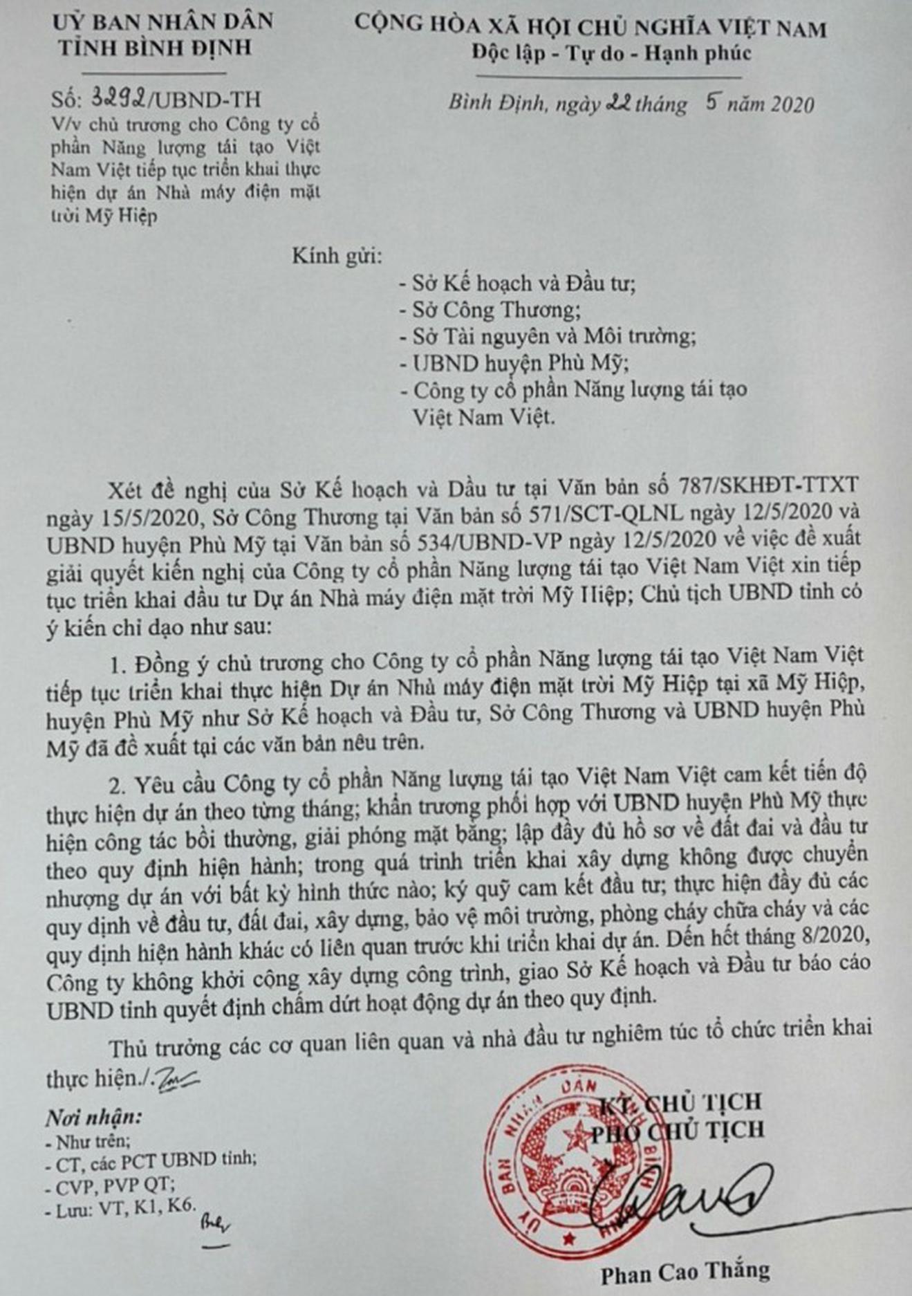 Văn bản của UBND tỉnh Bình Định đồng ý cho Cty Việt Nam Việt thực hiện DA sau khi đã thu hồi. Ảnh: Nhóm PV