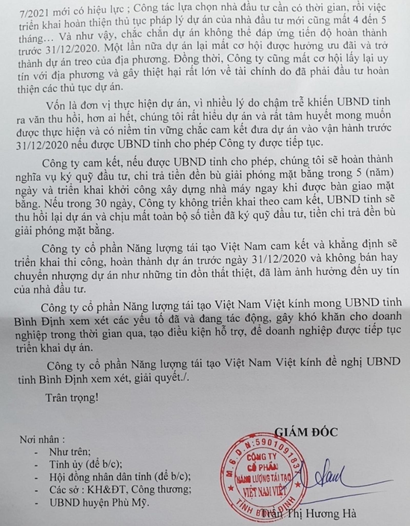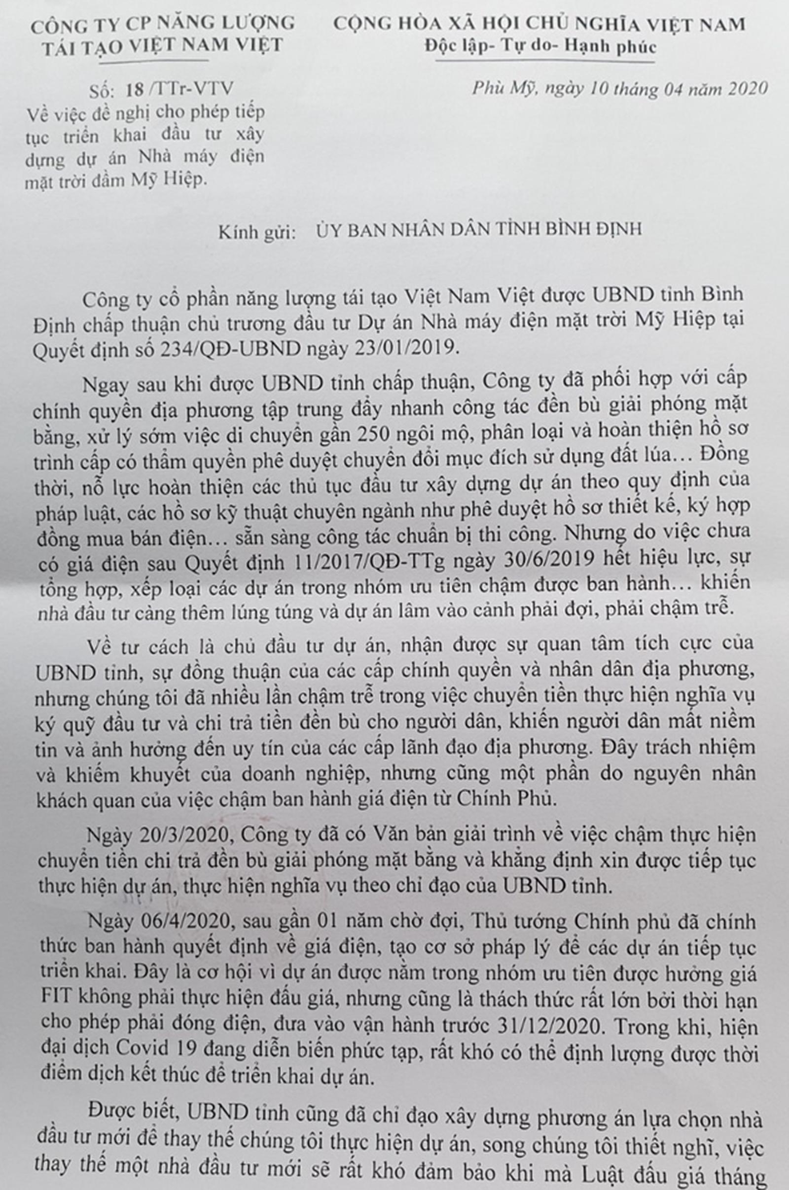 Văn bản của Cty Việt Nam Việt gửi UBND tỉnh Bình Định đề nghị tiếp tục thực hiện DA ĐMT Mỹ Hiệp. Ảnh: Nhóm PV