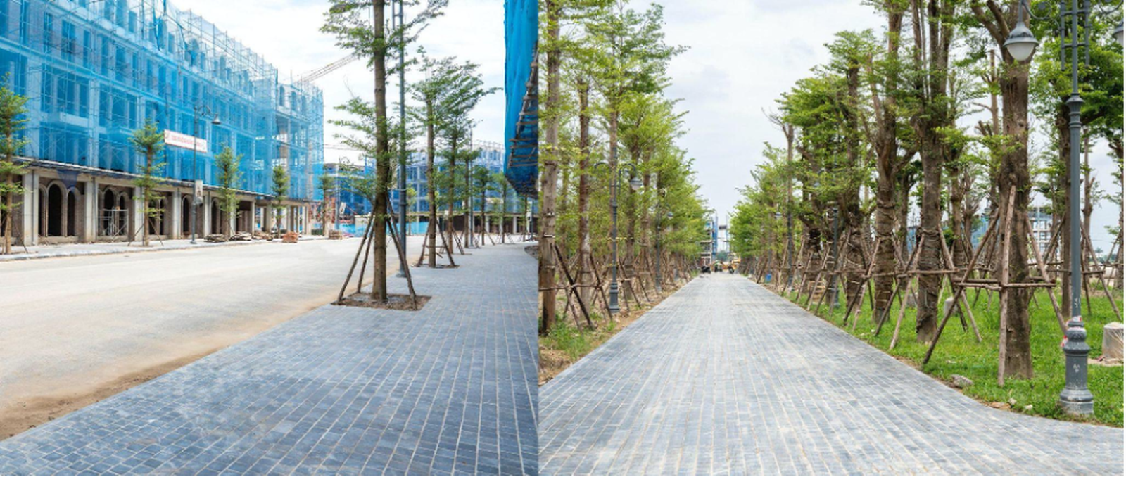 Hạ tầng nội khu và vỉa hè đang được hoàn thiện với cây xanh, hệ thống chiếu sáng và vật liệu đá lát được tuyển chọn kỹ lưỡng, có khả năng chống trơn trượt, chịu lực tốt, độ bền lên tới hàng trăm năm – tương đương tiêu chuẩn xây dựng tại các đô thị châu Âu.