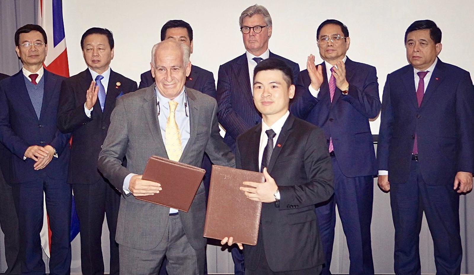 Ông Đỗ Vinh Quang, Thành viên HĐQT Tập đoàn T&T Group và đại diện Formula E Operations (Anh) trao thỏa thuận hợp tác nghiên cứu và khảo sát việc triển khai chương trình đua công thức 1 bằng xe điện