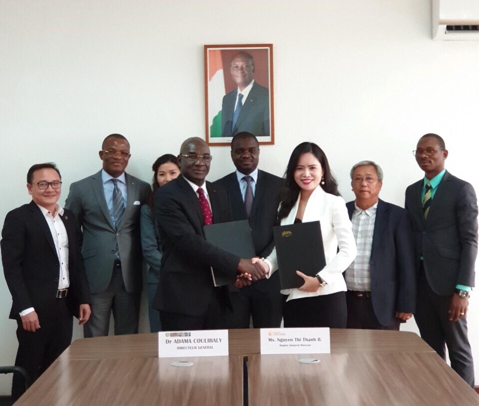 Tổng Giám đốc Hội đồng Bông và Điều Bờ Biển Ngà Coulibaly và Phó Tổng Giám đốc Tập đoàn T&T Group Nguyễn Thị Thanh Bình ký kết thỏa thuận hợp tác chiến lược tại Abidjan vào tháng 12/2018