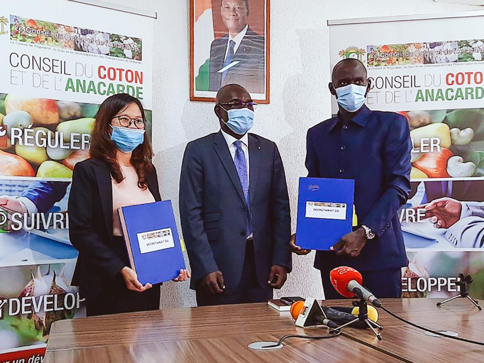 Đại diện Tập đoàn T&T Group và đại diện liên minh các nhà xuất khẩu điều Bờ Biển Ngà ký kết hợp đồng thu mua 150.000 tấn điều thô dưới sự chứng kiến của Hội đồng Bông và Điều Bờ Biển Ngà