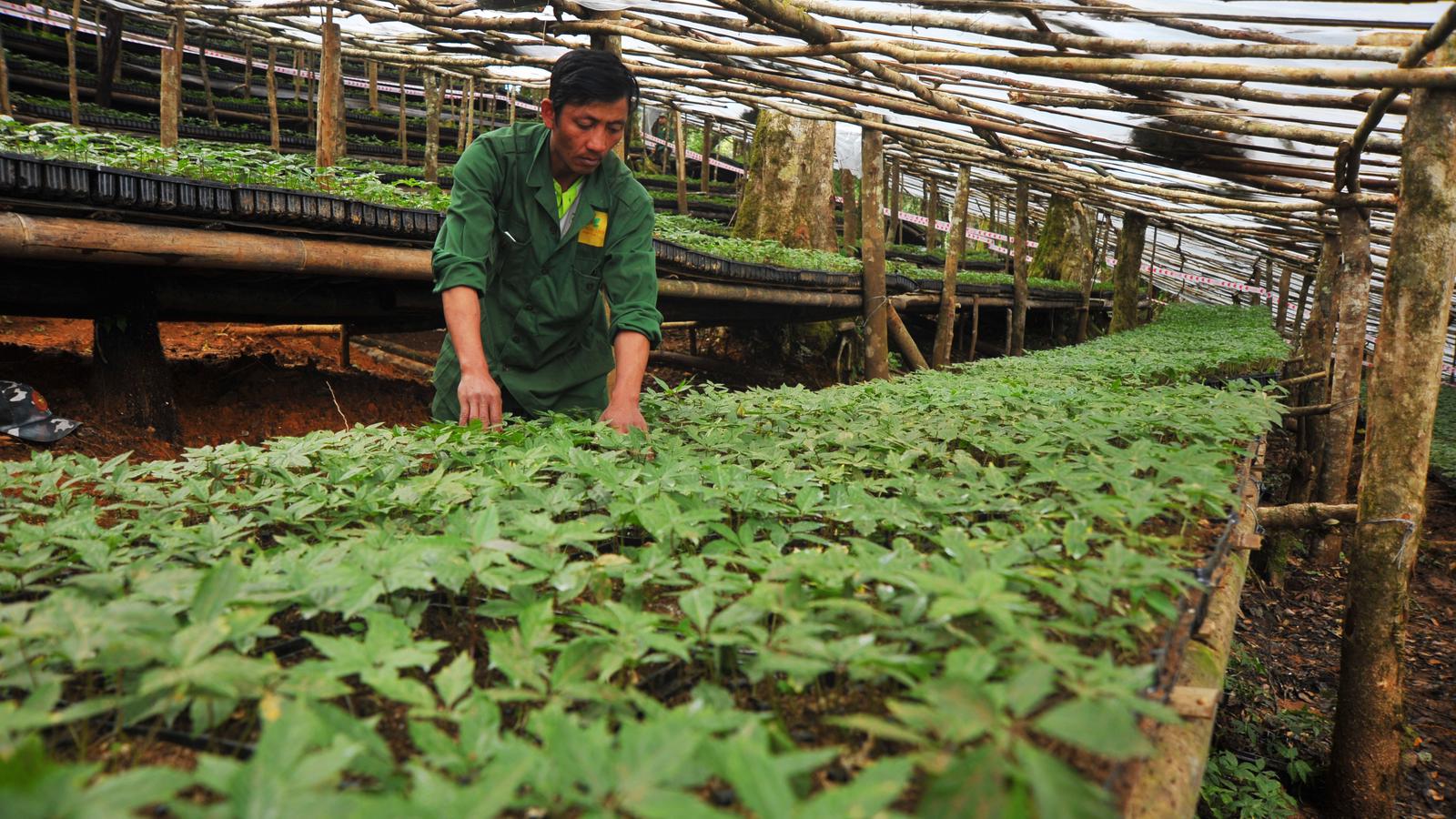 Các hộ dân được hướng dẫn kỹ thuật chăm sóc và vươn lên làm chủ vườn sâm qua việc cấp cây giống từ các công ty trồng sâm Ngọc Linh tại tỉnh Kon Tum. Ảnh: N.G