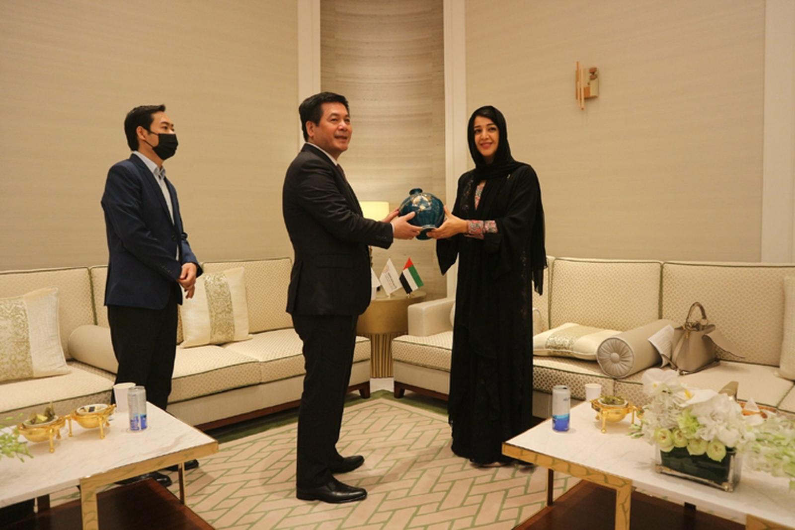 Bộ trưởng Nguyễn Hồng Diên tặng quà lưu niệm bà Reem Bint Ebrahim Al Hashimy, Quốc vụ khanh Bộ Ngoại giao & Hợp tác quốc tế UAE Tại buổi làm việc với ngài Abdulla Al Saleh, Quốc vụ khanh Bộ Kinh tế UAE, hai bên đã trao đổi thông tin về tình hình phát triển kinh tế, thương mại và những kết quả đạt được trong lĩnh vực hội nhập kinh tế của mỗi nước. Hai bên chia sẻ mối quan tâm chung về sự cần thiết ký kết một số văn bản pháp lý, thỏa thuận thương mại song phương để thiết lập cơ chế hợp tác thương mại mới, nhằm thúc đẩy mạnh mẽ trao đổi thương mại giữa hai nước trong giai đoạn hậu Covid-19. Hai bên nhất trí sẽ triển khai sớm trao đổi ở cấp kỹ thuật để nghiên cứu khả năng ký thỏa thuận thương mại song phương.Bộ trưởng Nguyễn Hồng Diên cho biết, hiện nay, Việt Nam đã tham gia 15 Hiệp định Thương mại tự do (FTA) song phương và đa phương, trong đó có một số hiệp định FTA thế hệ mới, có tiếp cận thị trường với 65 đối tác, trong đó có nhiều nền kinh tế lớn trên thế giới. Nhấn mạnh nền kinh tế Việt Nam có độ mở cao, Bộ trưởng cho rằng UAE sẽ có nhiều lợi ích khi đẩy mạnh hợp tác với Việt Nam. Hợp tác với Việt Nam có thể giúp khai thác không chỉ là thị trường gần 100 triệu dân, mà được kết nối với những thị trường lớn hơn nhiều, đó là ASEAN, và rộng hơn nữa là khu vực châu Á - Thái Bình Dương.Bộ trưởng nhận định dư địa cho hợp tác kinh tế, thương mại Việt Nam - UAE là rất lớn, tuy nhiên, kim ngạch hai chiều trong thời gian qua vẫn còn khiêm tốn. Trong thời gian tới, UAE có thể xuất khẩu các sản phẩm hóa dầu, công nghiệp công nghệ cao sang thị trường Việt Nam. Ngược lại, Việt Nam mong muốn xuất khẩu nhiều hơn các mặt hàng điện tử, hàng tiêu dùng, các mặt hàng nông thủy sản vào thị trường UAE. Để làm được điều này, hai Bên nỗ lực kết nối, tạo thuận lợi hơn nữa cho các doanh nghiệp.Khẳng định Việt Nam hiện đang là một trong những công xưởng của thế giới, Bộ trưởng cho biết Việt Nam có nhu cầu hợp tác rất lớn với các nước trong lĩnh vực logistics để thúc đẩy xuất khẩu hàng hóa. Vì vậy, phía Việt Nam mong muốn Bộ Kinh tế UAE giúp giới thiệu, kết nối với các doanh nghiệp logistics của UAE.Về lĩnh vực năng lượng, Bộ trưởng đánh giá cao vai trò của UAE trong ngành năng lượng quốc tế và tiềm năng thúc đẩy hợp tác với UAE trong lĩnh vực này. Trong thời gian qua, các doanh nghiệp Việt Nam đã nhập khẩu xăng dầu từ UAE nhưng chủ yếu là qua nước thứ ba. Bộ trưởng Nguyễn Hồng Diên nhấn mạnh sự cần thiết của việc thiết lập quan hệ đối tác trong lĩnh vực năng lượng giữa hai nước, đề nghị phía UAE ưu tiên cung ứng thường xuyên và ổn định xăng dầu, khí đốt và các sản phẩm liên quan cho Việt Nam với giá ưu đãi và chiết khấu hợp lý.Quốc vụ khanh Bộ Kinh tế UAE đánh giá cao chuyến công tác của Bộ trưởng Nguyễn Hồng Diên và những kết quả tích cực đạt được. Cho rằng những đề xuất của Bộ trưởng Bộ Công Thương liên quan đến những vấn đề cơ bản và trọng yếu trong hợp tác kinh tế giữa hai nước, ông bày tỏ sự ủng hộ và đề nghị Bộ trưởng cùng phối hợp, chỉ đạo cấp kỹ thuật triển khai. Ông đánh giá cao những đề xuất của Bộ trưởng không chỉ giải quyết những vấn đề cấp thiết mà còn có tầm nhìn chiến lược lâu dài trong phát triển quan hệ hợp tác kinh tế, thương mại giữa hai nước. Ông cho biết UAE là nền kinh tế cởi mở, năng động, ổn định và là địa điểm lý tưởng để các doanh nghiệp nước ngoài đến đầu tư, kinh doanh, trong đó có các doanh nghiệp Việt Nam.Phía UAE cũng mong muốn đa dạng hóa, tăng cường đầu tư ra nước ngoài và Việt Nam nằm trong danh sách ưu tiên nhờ có môi trường kinh doanh ổn định, những nỗ lực và thành tựu trong đổi mới, hoàn thiện thể chế, pháp luật, chính sách. Phía UAE đề nghị tổ chức họp trực tuyến ở cấp kỹ thuật để nghiên cứu khả năng ký một số thỏa thuận thương mại song phương.
