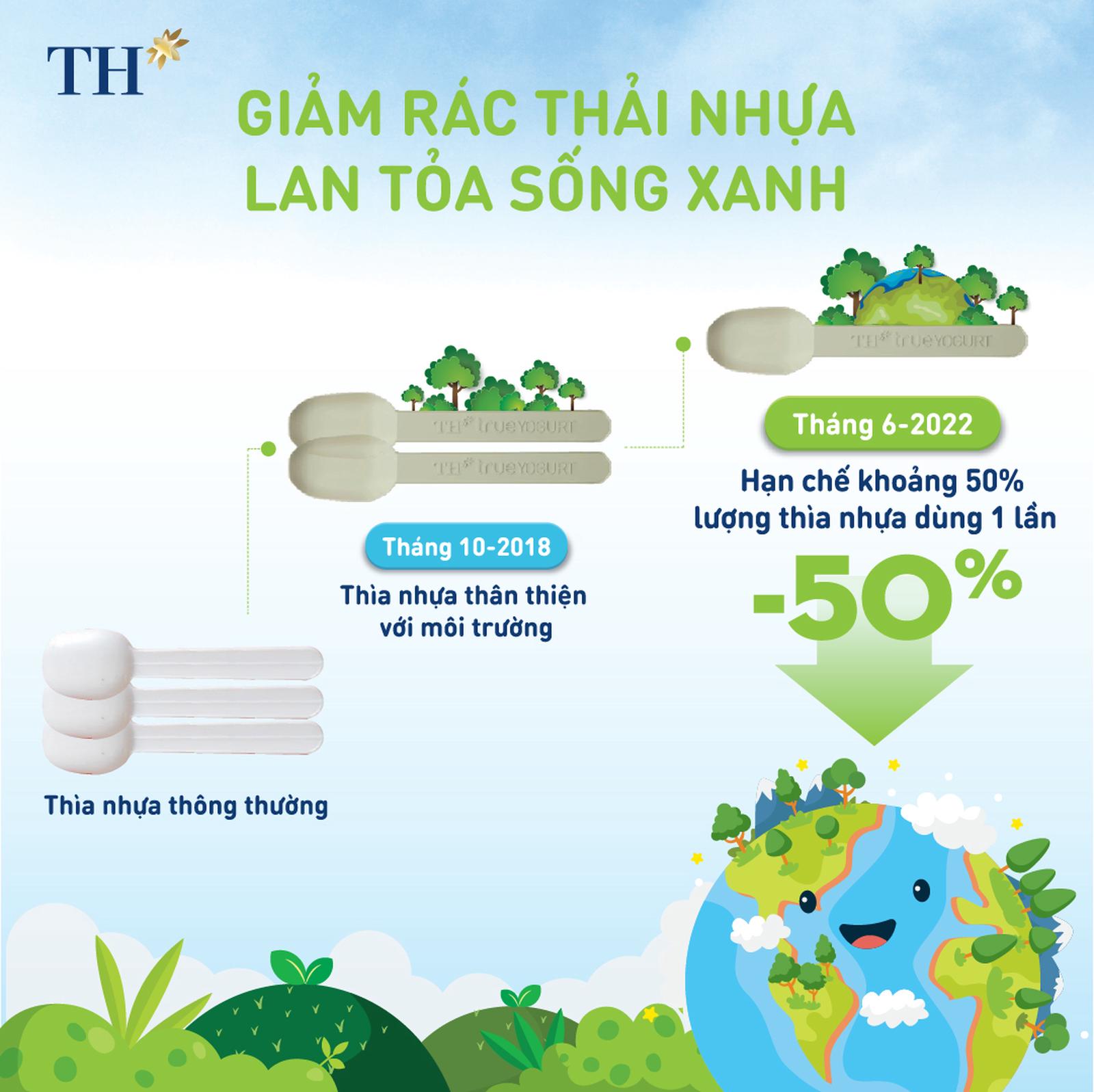 Thực tế, trong 4 năm qua, từ năm 2018, thìa sữa chua dùng một lần của TH đã được làm hoàn toàn từ nguyên liệu nhựa thân thiện hơn với môi trường – có nguồn gốc chủ yếu từ tinh bột thực vật như ngô, sắn, mía, thay thế hoàn toàn loại thìa từ nguyên liệu nhựa PE. Với giải pháp đó, TH đã là doanh nghiệp sữa tiên phong trên thị trường Việt Nam ứng dụng giải pháp thìa nhựa thân thiện với môi trường từ các nguyên liệu có thể tái tạo. Việc chưa dừng lại ở đó, và từ 1/6/2022 có hành động mạnh mẽ giảm 50% số lượng thìa nhựa dùng một lần, TH tiếp tục đẩy nhanh các đóng góp của mình trong việc giảm nhẹ gánh nặng của vấn nạn rác thải nhựa dùng một lần tại Việt Nam và trên thế giới. Các khách hàng của TH được khuyến khích sử dụng ít đi những sản phẩm nhựa dùng một lần – dù cho đó đã là loại vật dụng từ nhựa thân thiện hơn với môi trường.