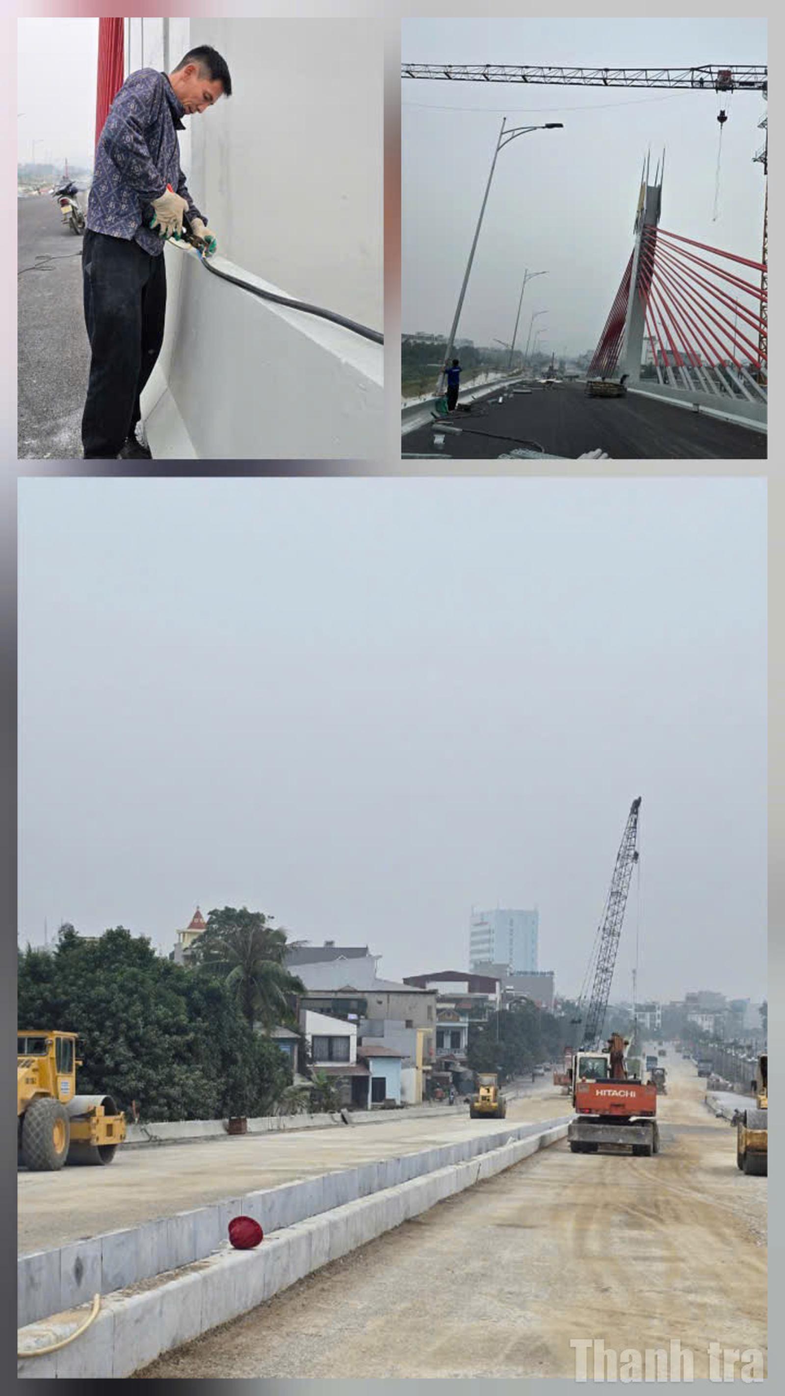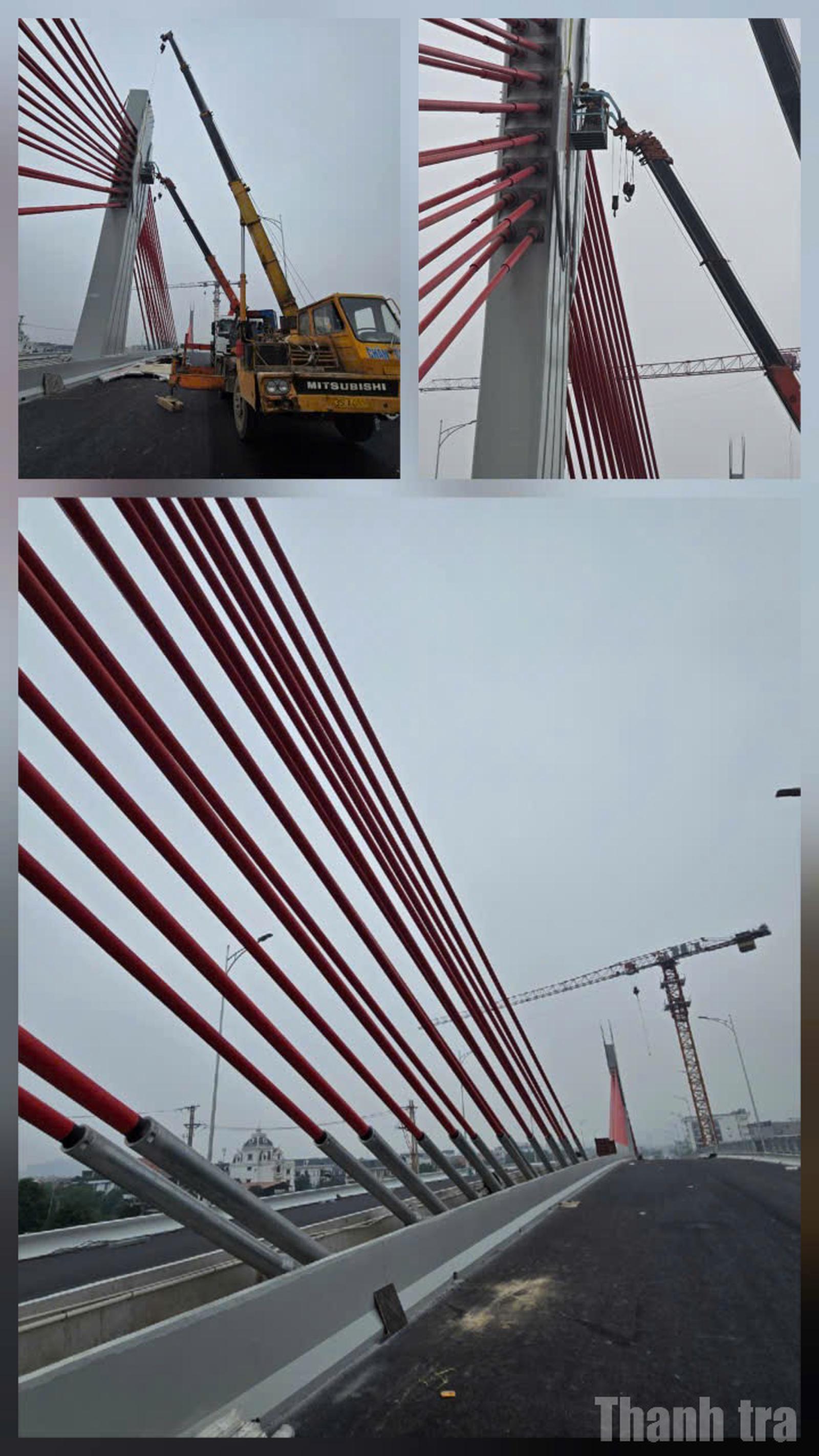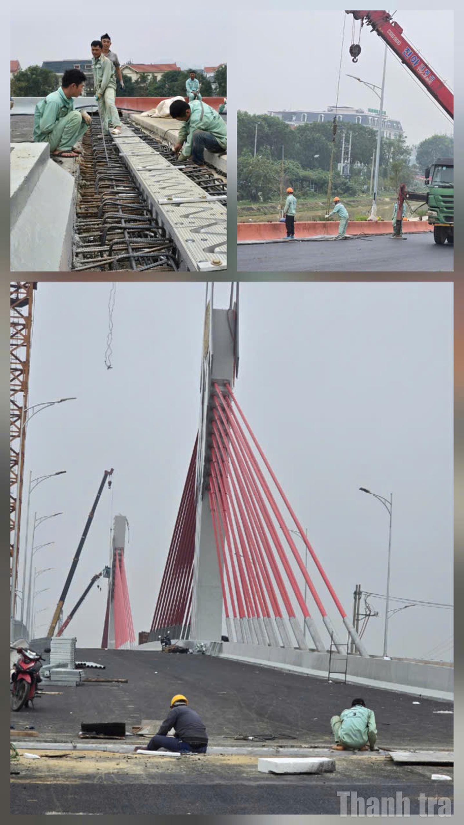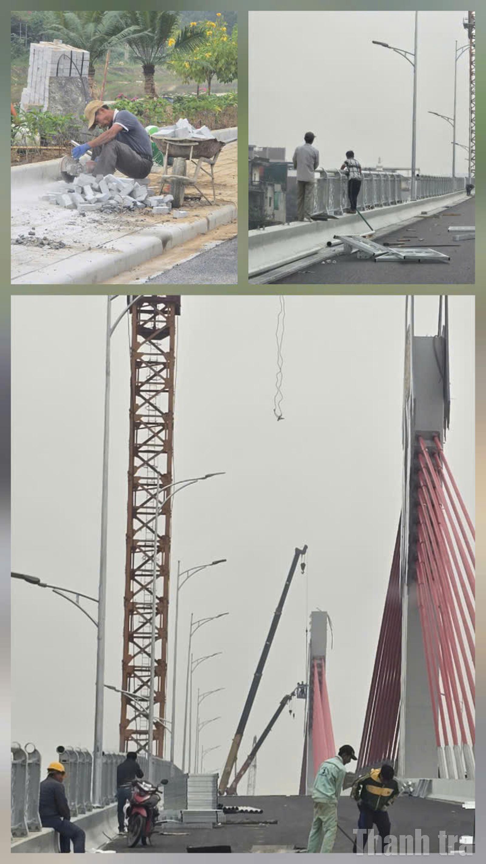 Những phần việc cuối cùng của dự án cầu dây văng đầu tiên ở Thanh Hóa đang gấp rút hoàn thành cho ngày thông xe. Ảnh: Văn Thanh