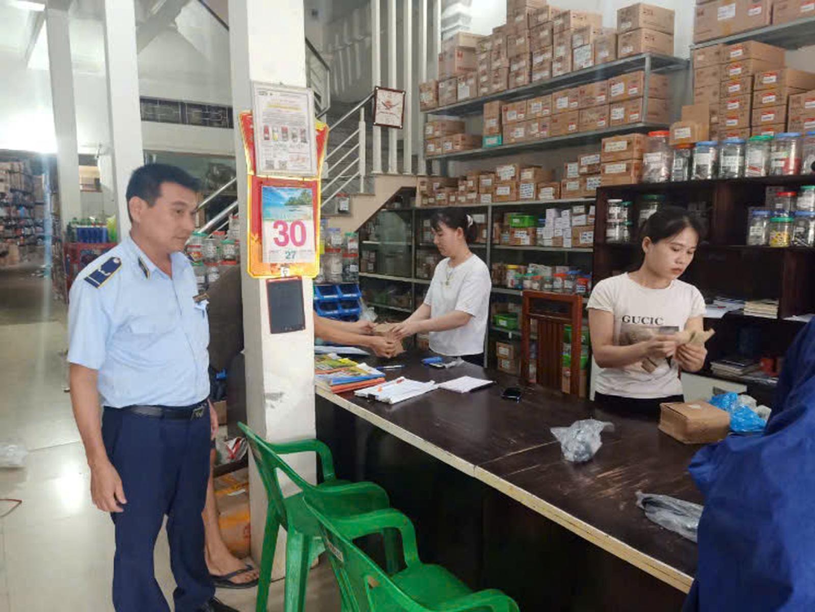 Lực lượng quản lý thị trường tỉnh Thanh Hoá kiểm tra, xử phạt cơ sở trưng bày để bán hàng hoá giả mạo nhãn hiệu. Ảnh: Quản lý thị trường Thanh Hoá