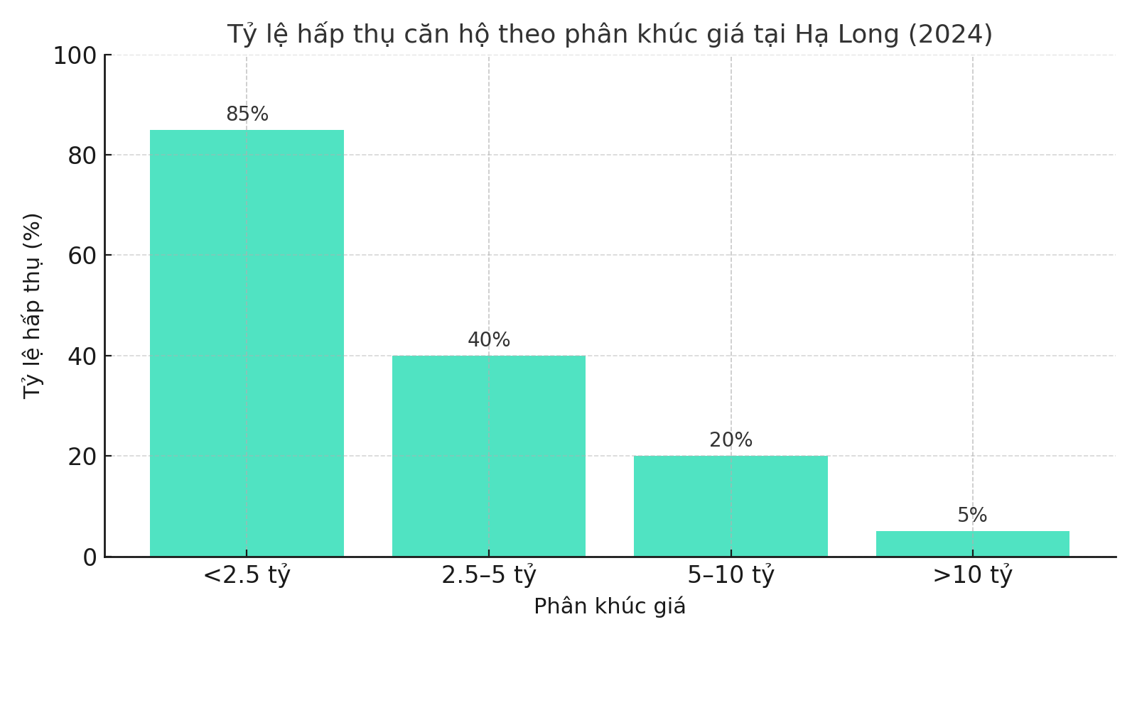 Báo cáo quý IV/2024 cho thấy, toàn bộ Hạ Long chỉ ghi nhận 73 căn hộ ở (Misaki Tower) và 13 căn hộ TMDV (Phoenix Legend) mở bán mới – con số thấp kỷ lục so với sức cầu thực tế. Phân khúc căn hộ dưới 2,5 tỷ đồng có tỷ lệ hấp thụ cao nhất, nhưng gần như không còn nguồn cung sơ cấp.