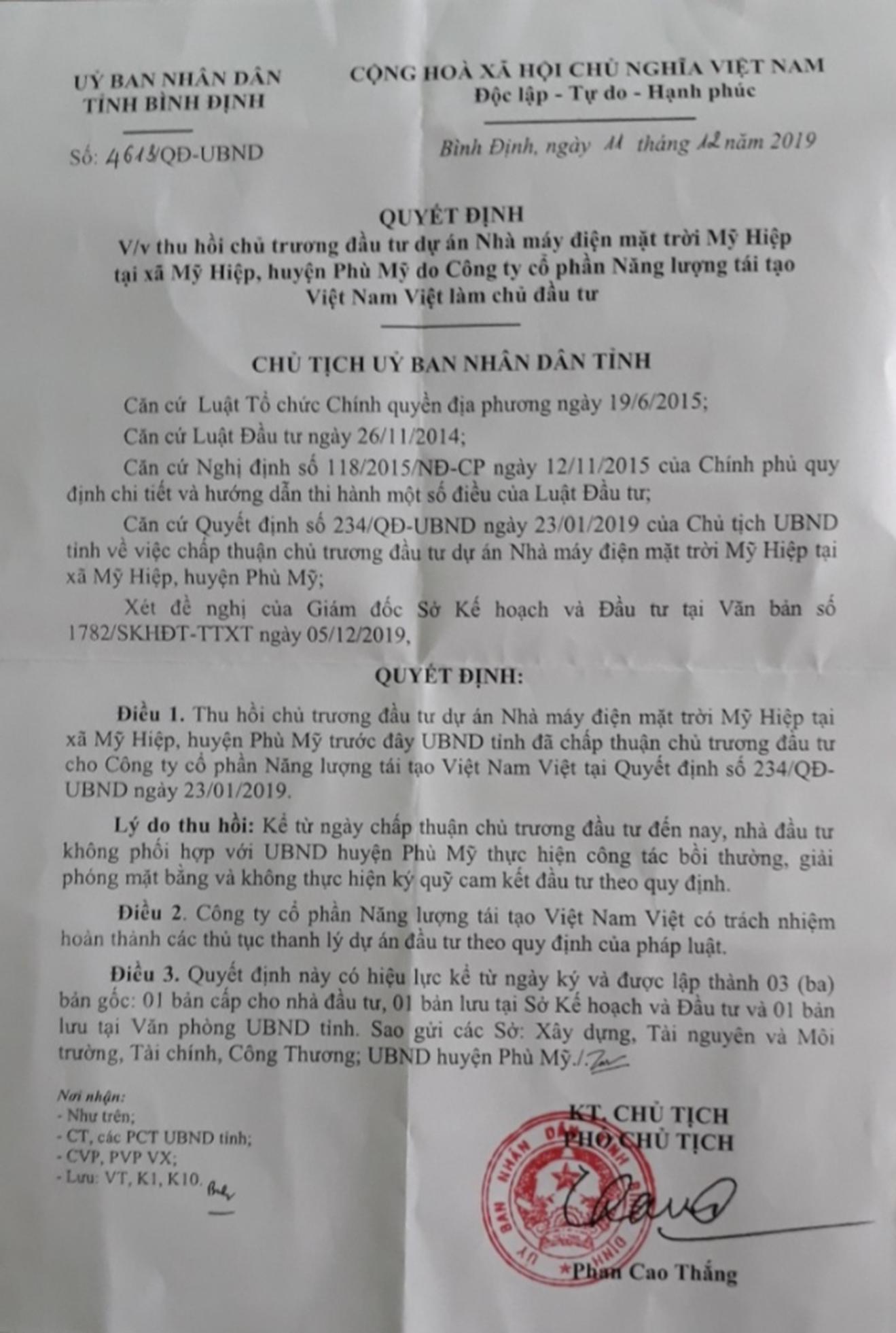 Chỉ sau 11 tháng DA bị UBND tỉnh Bình Định ban hành Quyết định số 4613/QĐ-UBND ngày 11/12/2019 về việc thu hồi chủ trương đầu tư đã cấp cho Cty Việt Nam Việt. Lý do UBND tỉnh thu hồi DA là nhà đầu tư không phối hợp với UBND huyện Phù Mỹ để thực hiện công tác bồi thường, giải phóng mặt bằng và không thực hiện ký quỹ cam kết đầu tư theo quy định.