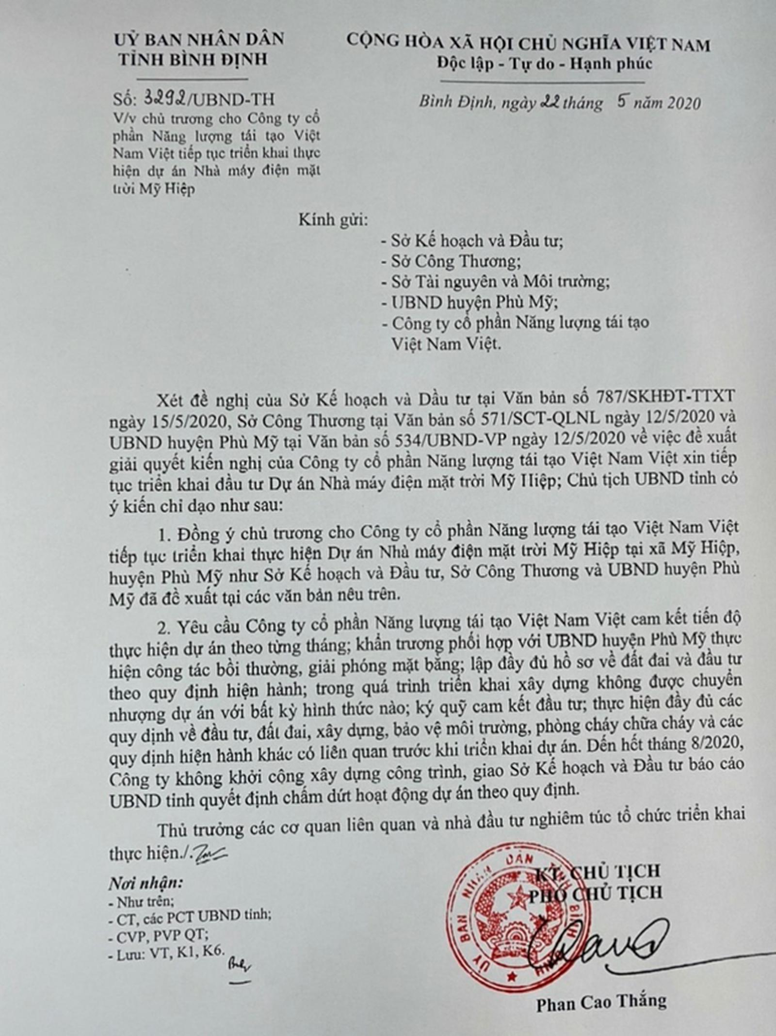 Tuy nhiên, sau khoảng 5 tháng thu hồi DA đến ngày 22/5/2020, Phó Chủ tịch UBND tỉnh Bình Định Phan Cao Thắng lại ký Công văn số 3292/UBD-TH về việc chủ trương cho Cty Việt Nam Việt tiếp tục triển khai thực hiện DA Nhà máy Điện mặt trời Mỹ Hiệp. Vậy, việc UBND tỉnh Bình Định sau khi ký quyết định thu hồi DA, rồi lại tiếp tục ký cho phép triển khai có đúng với trình tự của pháp luật về đầu tư? Báo Thanh tra sẽ tiếp tục thông tin đến bạn đọc trong bài viết tiếp theo.