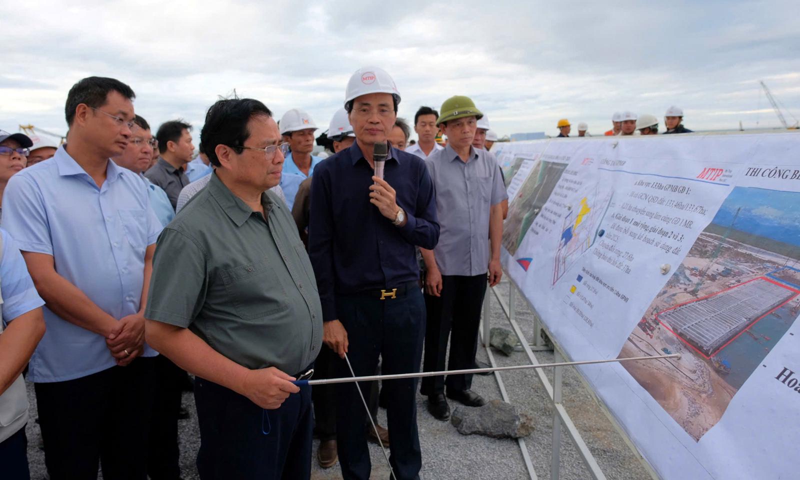 Thủ tướng Phạm Minh Chính kiểm tra tại dự án Khu bến cảng Mỹ Thủy. Ảnh: Minh Tân