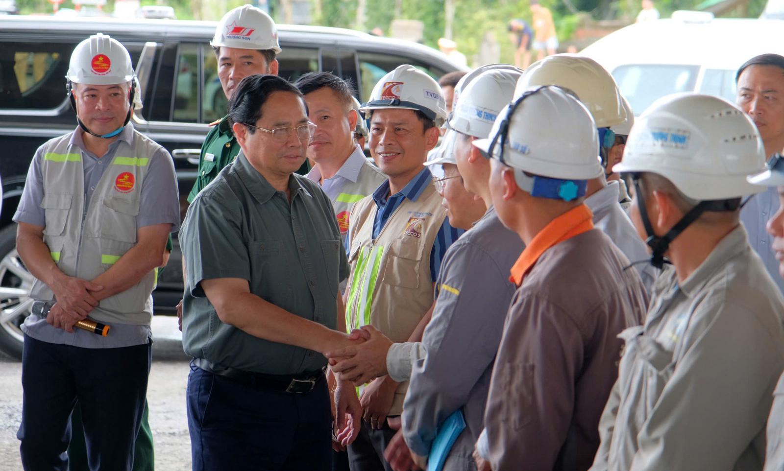 Thủ tướng động viên, hỏi thăm cho các cán bộ, công nhân thi công dự án. Ảnh: Minh Tân